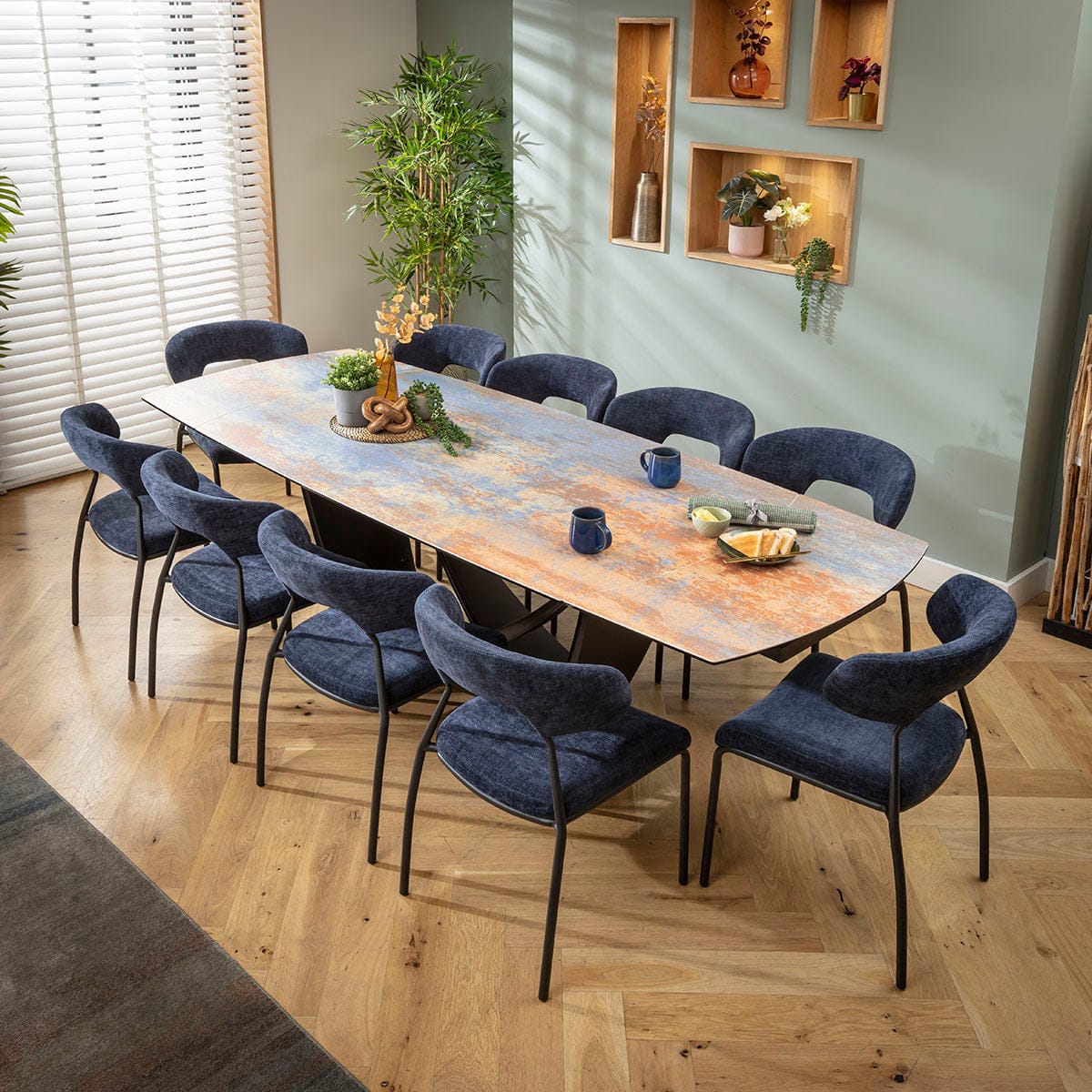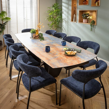The Zelda extendable dining table combines industrial style with premium craftsmanship. Extending from 180cm to 260cm, it comfortably seats 10 people. The rustic blue and orange printed ceramic top is both artistic and practical - resistant to scratches, stains, and heat. Its interwoven black metal pedestal base adds bold character, while the smooth one-handed extension system lets you expand the table with ease. Functional, striking, and built to last.
