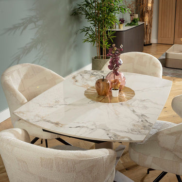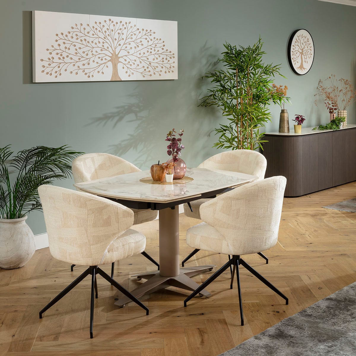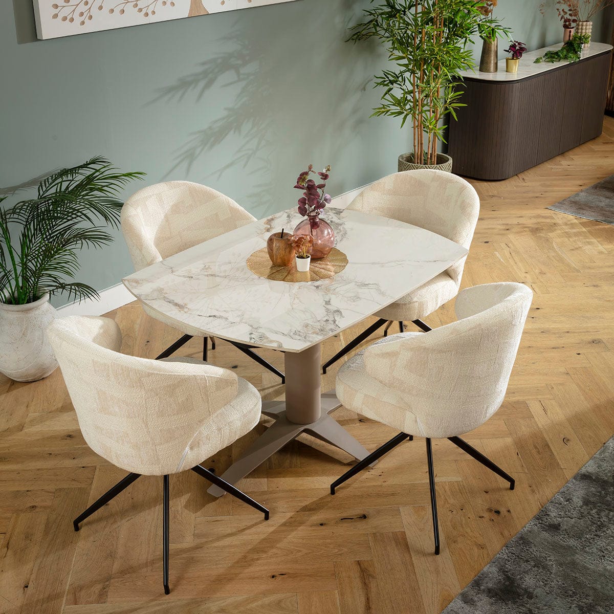 This 4 seater dining table and chair set includes a marble-effect extendable dining table that blends style with expert engineering in beige and white, with unique cream dining chairs that make a statement featuring textured weave and soft chenille. This modern dining set is crafted for durability and comfort.