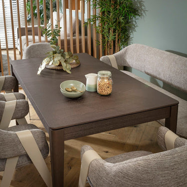 This 7 seater bench dining set includes a large extendable wooden dining table showcasing a brown oak veneer and a tactile wood grain, with a Freya dining bench featuring a supportive backrest, plus 4 chairs in super-soft grey fabric. This modern dining set is crafted for practicality and comfort.