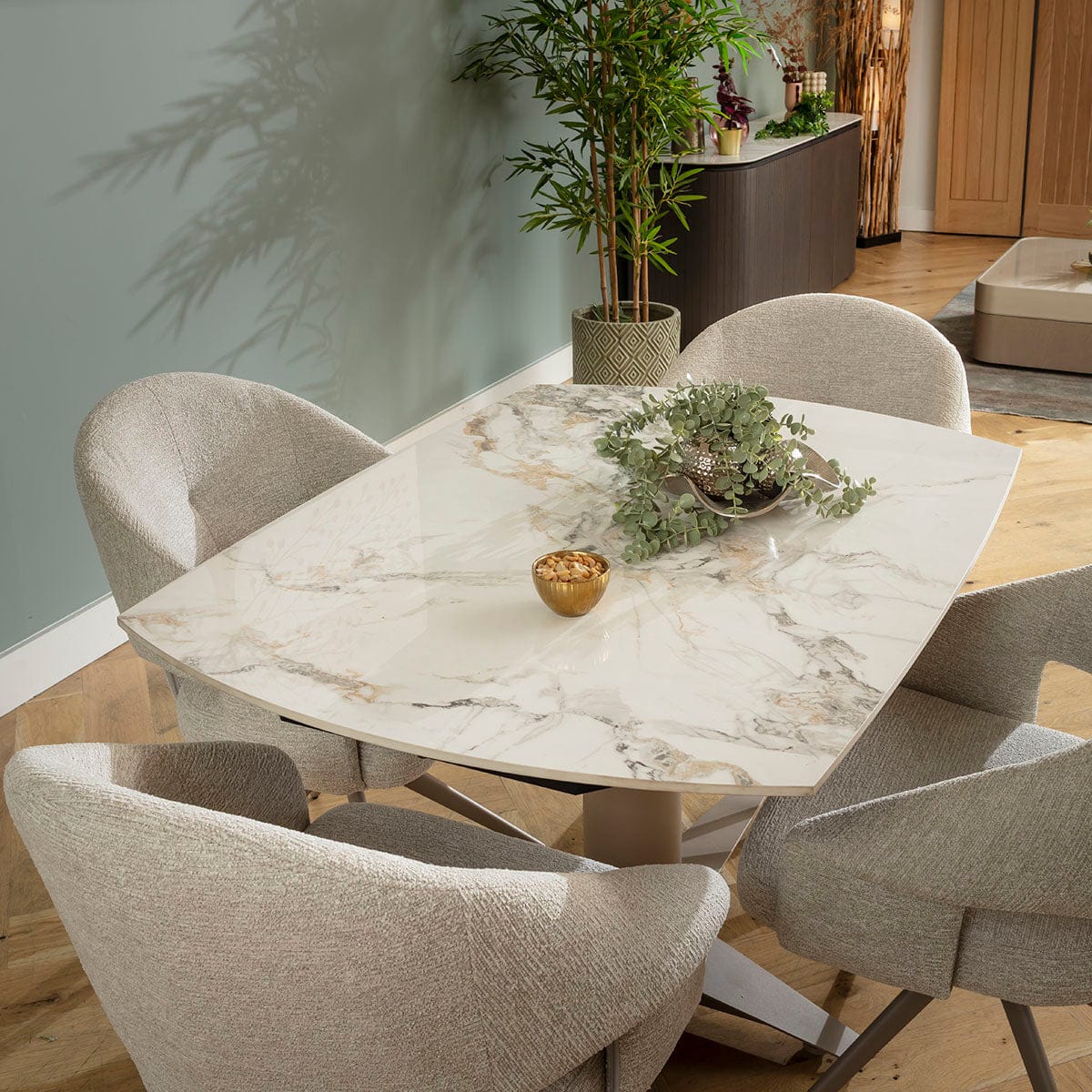 The small Johnson extendable dining table introduces a unique colour palette with a white ceramic marble top enhanced by graceful veining. The polished surface offers refinement while ceramic resists scratches, stains and heat. A beige metal base with a distinctive modern silhouette supports the 4 seater format. Curved edges soften the geometry, giving the piece an elegant, contemporary character. Measuring 120 x 88cm and reaching 160cm when opened, the tabletop extends effortlessly as concealed leaves emerge while you rotate it using the innovative auto-extend mechanism. Closing leaves no separation, keeping the surface flawless. Premium ceramic and robust steel ensure lasting strength. Quatropi stands for quality, backed by superior craftsmanship.