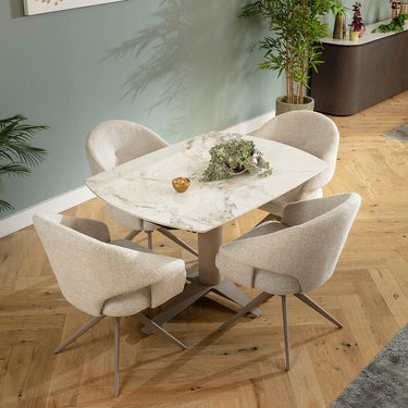 This 4 seater dining table and chair set includes a marble-effect extendable dining table that blends style with expert engineering in beige and white, with unique dining room chairs featuring a cream aesthetic and smooth swivel performance. This modern dining set is crafted for durability and comfort.