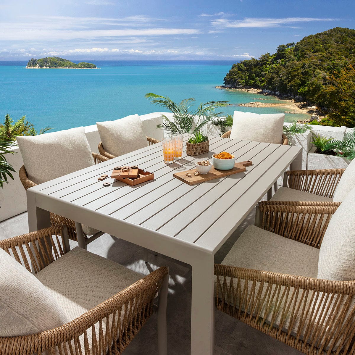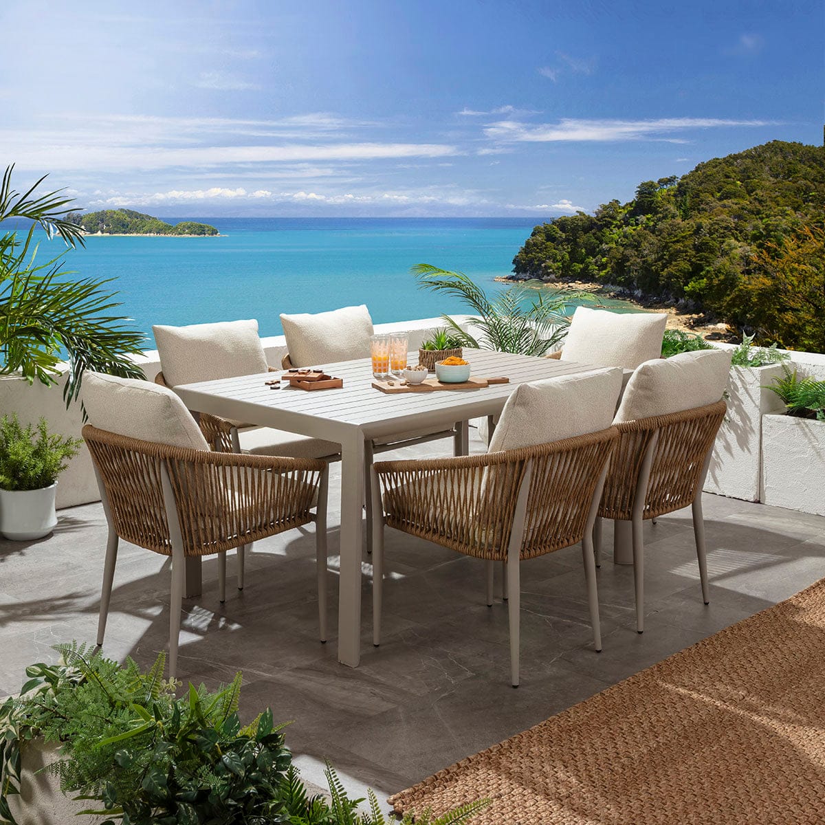 This 6 seater garden dining table and chairs set includes an almond grey extending dining table designed for summer living, crafted from all-weather aluminium, with aluminium dining chairs with natural rope weave detailing and premium honey cushions. This outdoor dining set is crafted for durability and comfort.