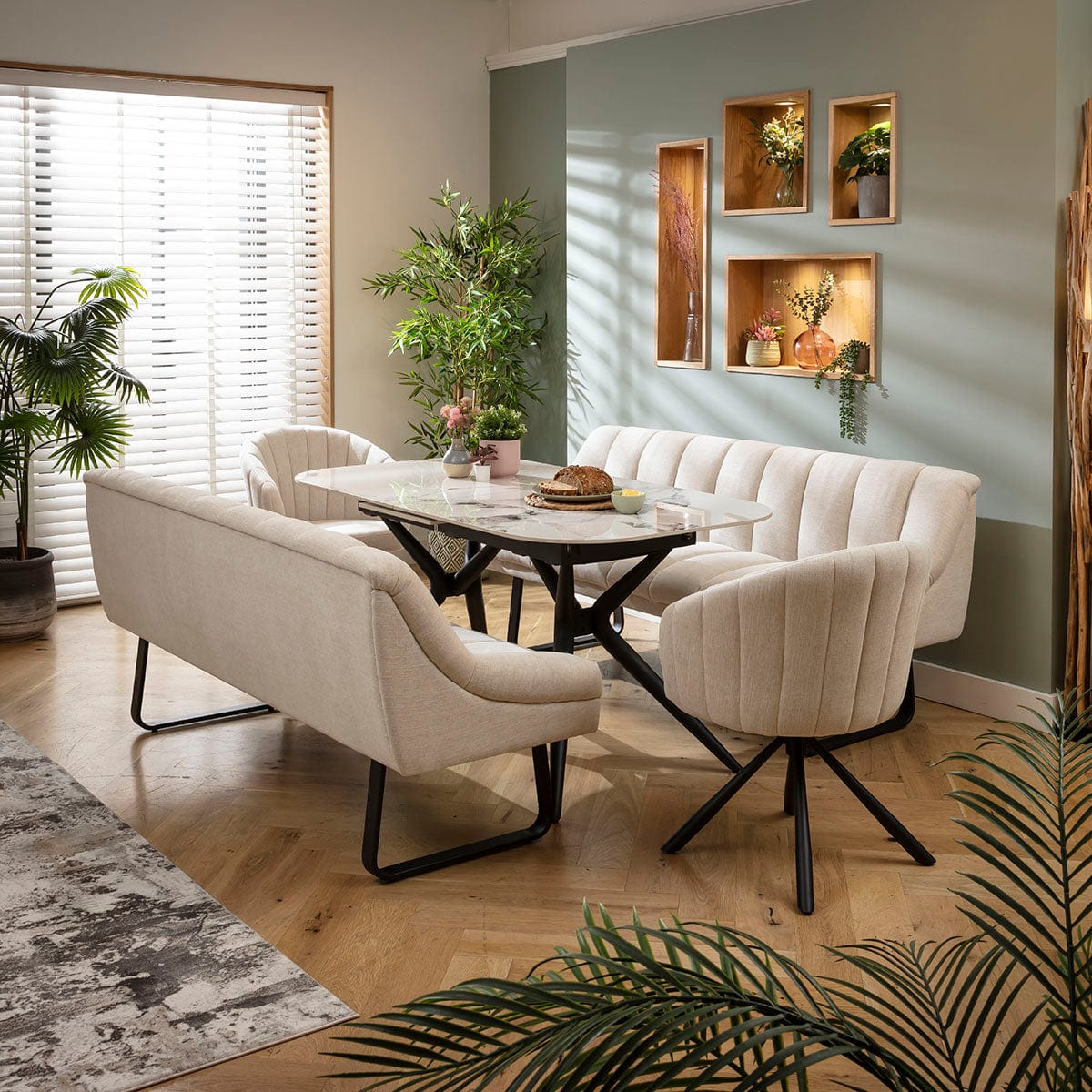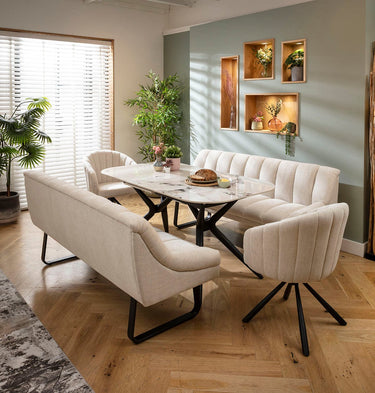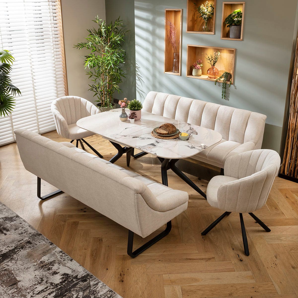 This 8 seater bench dining set includes our modern extending dining table, it has a luxury white gold ceramic marble top and metal legs, with two Harvey dining benches with backrests, plus 2 chairs in super-soft stone fabric. This modern dining set is crafted for practicality and comfort.