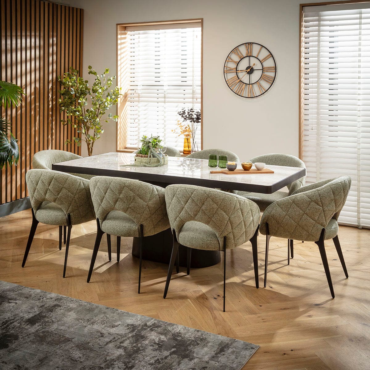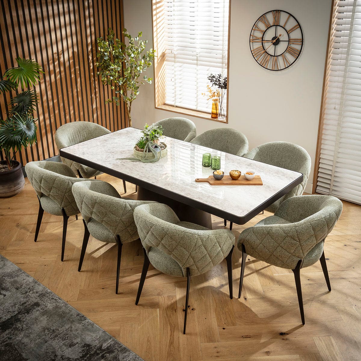 This 8 seater dining table and chair set includes a contemporary dining table crafted from premium black oak and grey marble-effect ceramic, with green dining chairs boasting diamond-quilted detailing and black metal legs. This modern dining set is crafted for durability and comfort.