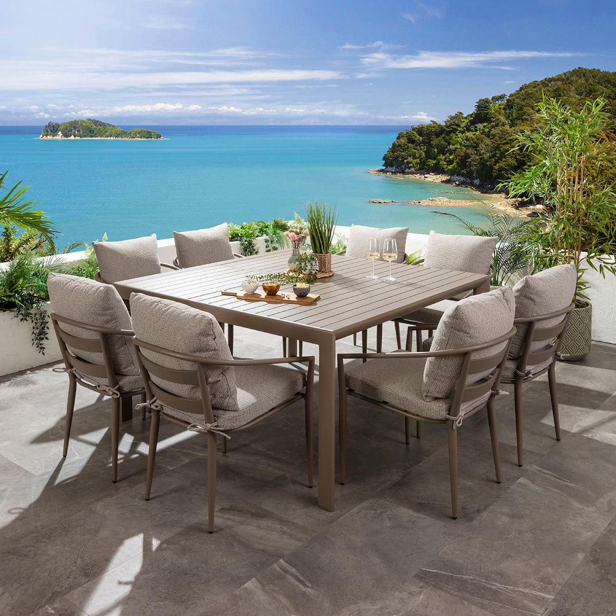 This 8 seater garden dining table and chairs set includes a beige extending dining table designed for summer living, crafted from all-weather aluminium, with contemporary weatherproof and durable aluminium dining chairs, plus cream removable cushions. This outdoor dining set is crafted for durability and comfort.