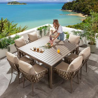 This 8 seater garden dining table and chairs set includes a beige extending dining table designed for summer living, crafted from all-weather aluminium, with beige rope garden dining chairs made from aluminium, making them weather-resistant for outdoor use. This outdoor dining set is crafted for durability and comfort.