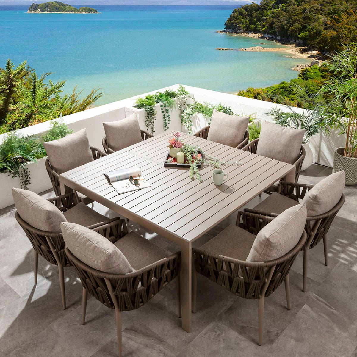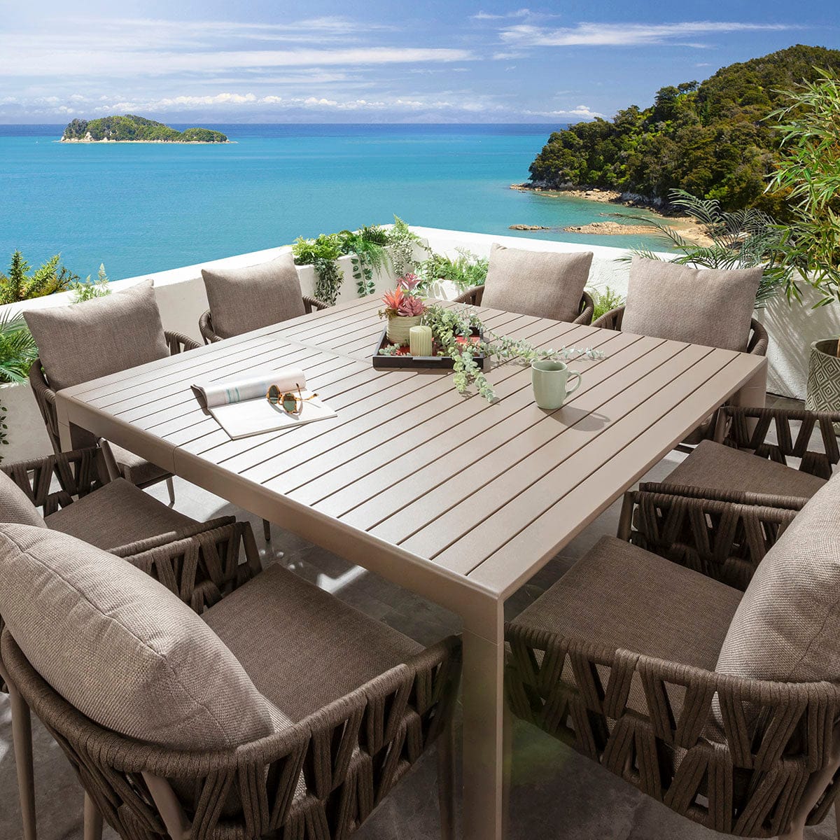 This 8 seater garden dining table and chairs set includes a beige extending dining table designed for summer living, crafted from all-weather aluminium, with brown luxury dining chairs featuring durable aluminium frames and premium cushions. This outdoor dining set is crafted for durability and comfort.