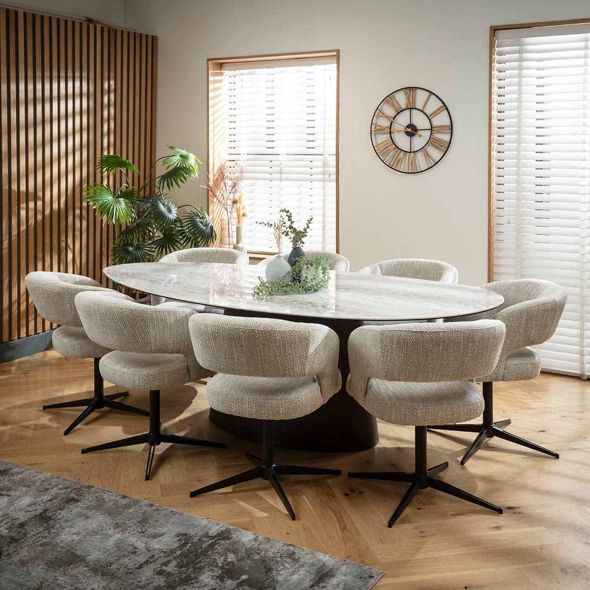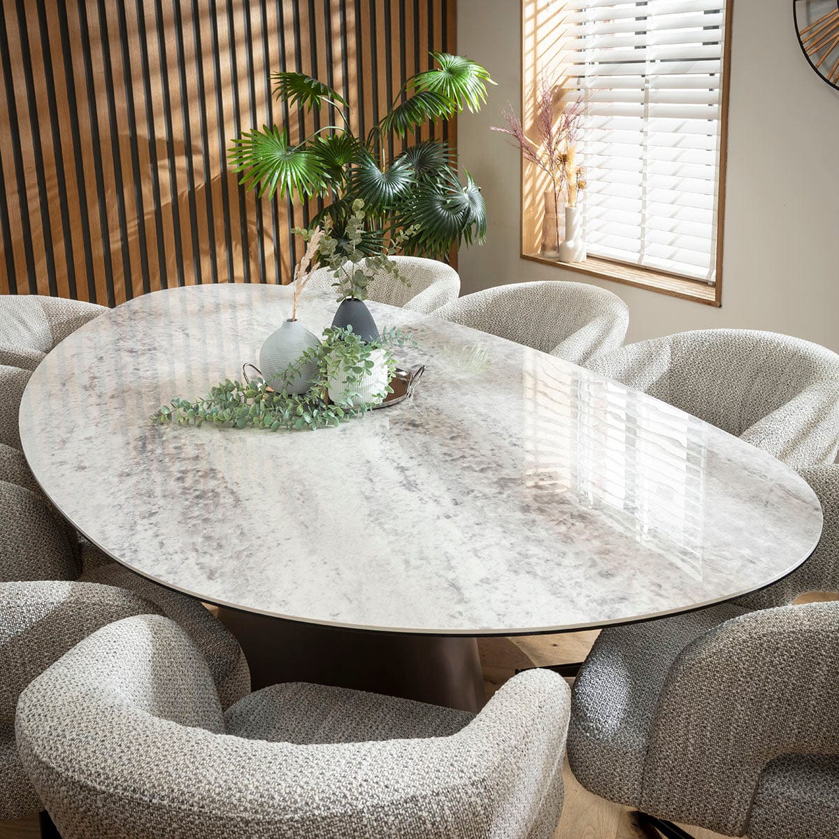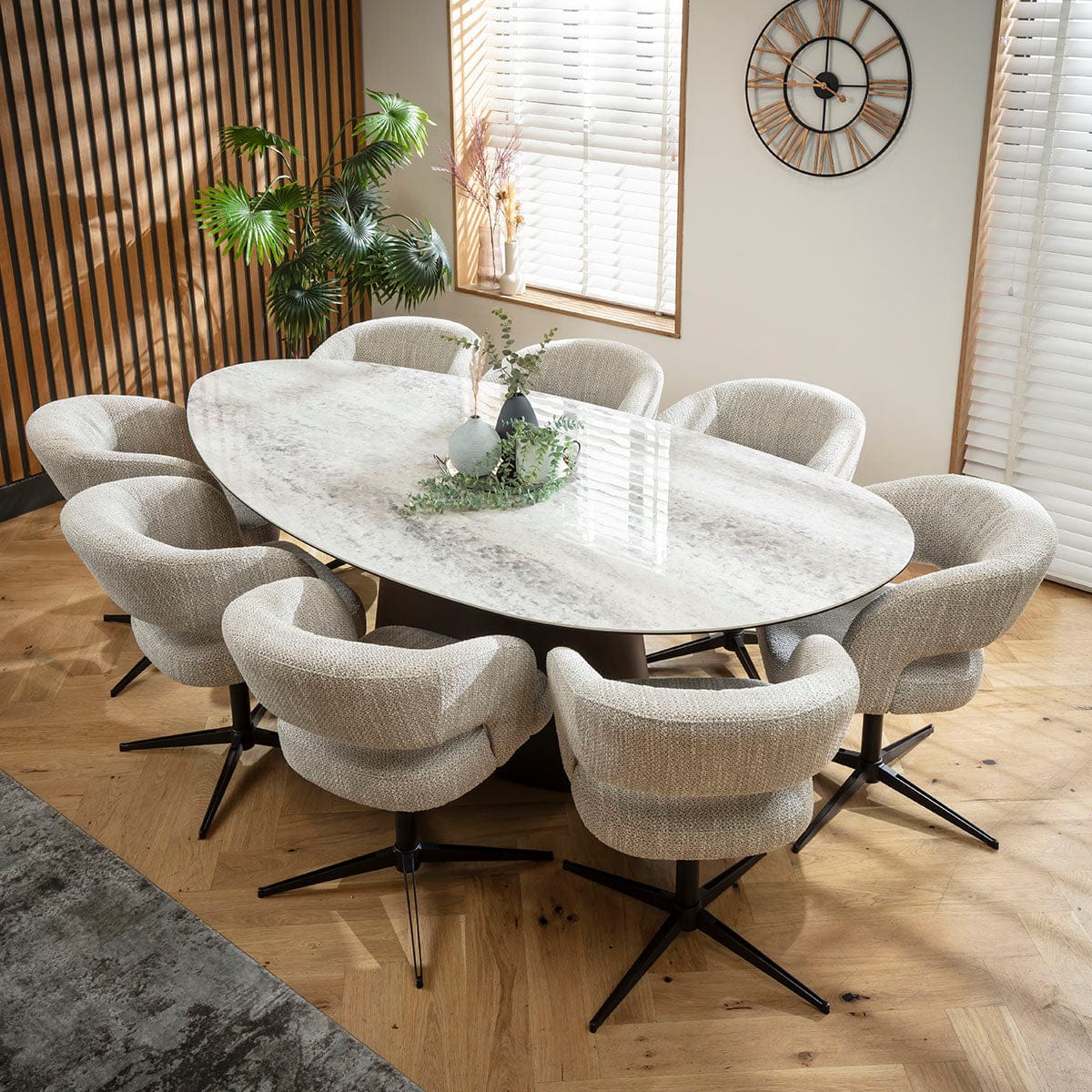 This 8 seater dining table and chair set includes a contemporary ceramic marble dining table crafted with an oval form and a premium grey walnut base, with modern swivel dining chairs boasting Scandi design and durability in grey woven fabric. This modern dining set is crafted for durability and comfort.