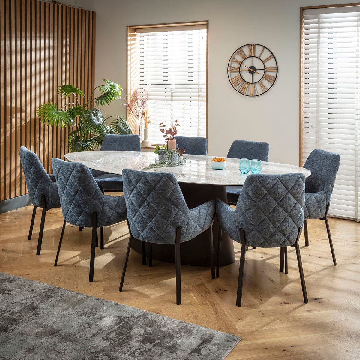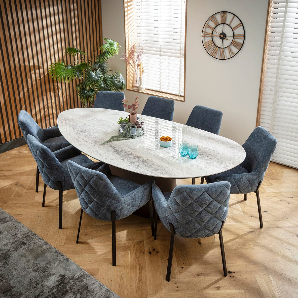 This 8 seater dining table and chair set includes a contemporary ceramic marble dining table crafted with an oval form and a premium grey walnut base, with blue chenille fabric dining chairs adorned with low sweeping arms a unique leg design. This modern dining set is crafted for durability and comfort.