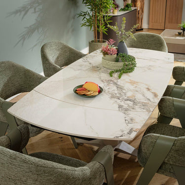 The small Johnson extendable dining table introduces a unique colour palette with a white ceramic marble top enhanced by graceful veining. The polished surface offers refinement while ceramic resists scratches, stains and heat. A beige metal base with a distinctive modern silhouette supports the 6 seater format. Curved edges soften the geometry, giving the piece an elegant, contemporary character. Measuring 120 x 88cm and reaching 160cm when opened, the tabletop extends effortlessly as concealed leaves emerge while you rotate it using the innovative auto-extend mechanism. Closing leaves no separation, keeping the surface flawless. Premium ceramic and robust steel ensure lasting strength. Quatropi stands for quality, backed by superior craftsmanship.