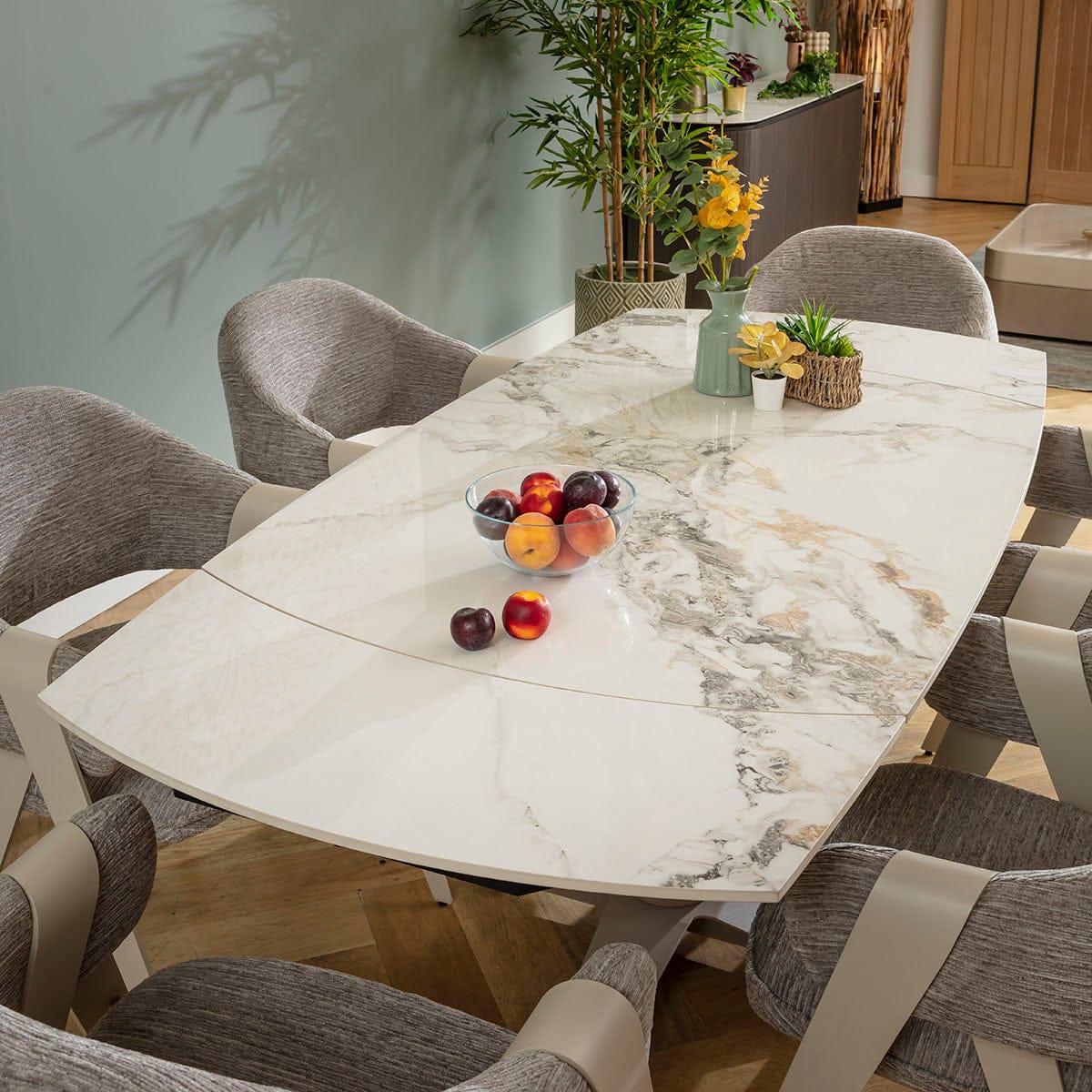 The small Johnson extendable dining table introduces a unique colour palette with a white ceramic marble top enhanced by graceful veining. The polished surface offers refinement while ceramic resists scratches, stains and heat. A beige metal base with a distinctive modern silhouette supports the 6 seater format. Curved edges soften the geometry, giving the piece an elegant, contemporary character. Measuring 120 x 88cm and reaching 160cm when opened, the tabletop extends effortlessly as concealed leaves emerge while you rotate it using the innovative auto-extend mechanism. Closing leaves no separation, keeping the surface flawless. Premium ceramic and robust steel ensure lasting strength. Quatropi stands for quality, backed by superior craftsmanship.