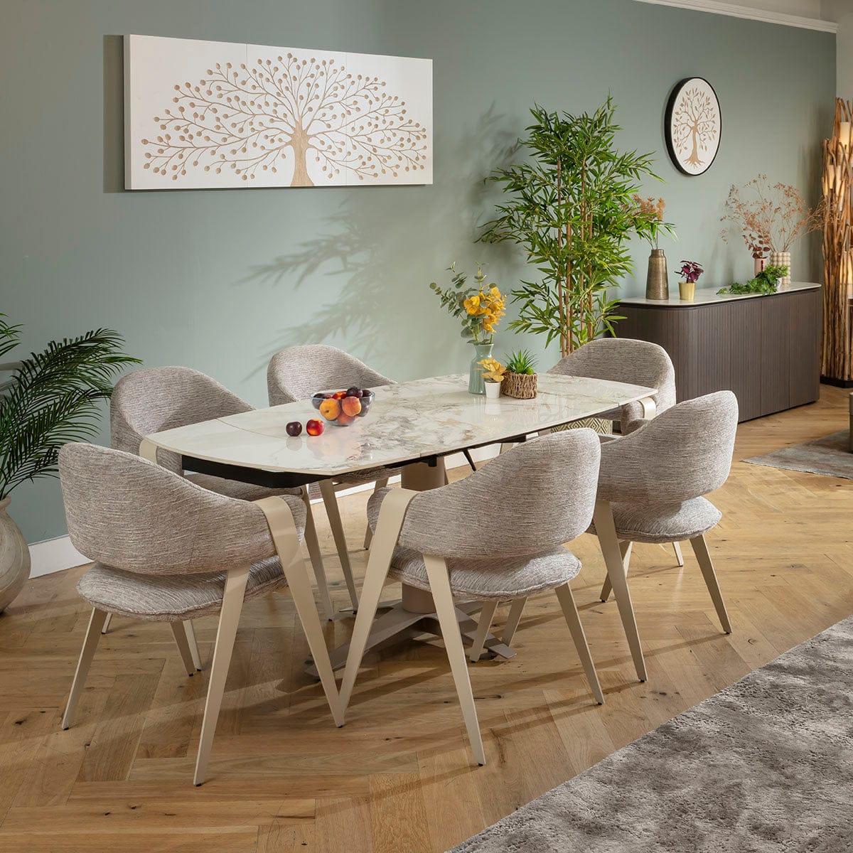 This 6 seater dining table and chair set includes a marble-effect extendable dining table that blends style with expert engineering in beige and white, with a Freya dining bench featuring a supportive backrest, plus 4 chairs in super-soft grey fabric. This modern dining set is crafted for durability and comfort.