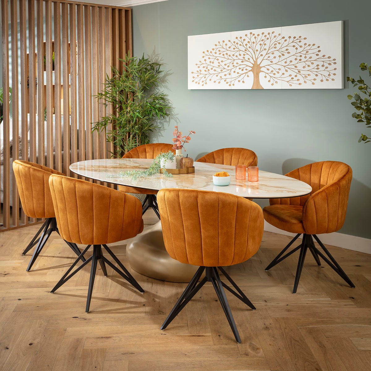 This 6-seater dining table and chair set includes a large oval-shaped ceramic marble dining table with a unique pedestal base in champion gold, and swivel chairs featuring elegant scalloped detailing and wraparound arms in rich saffron velvet. This modern dining set is crafted for durability and comfort.