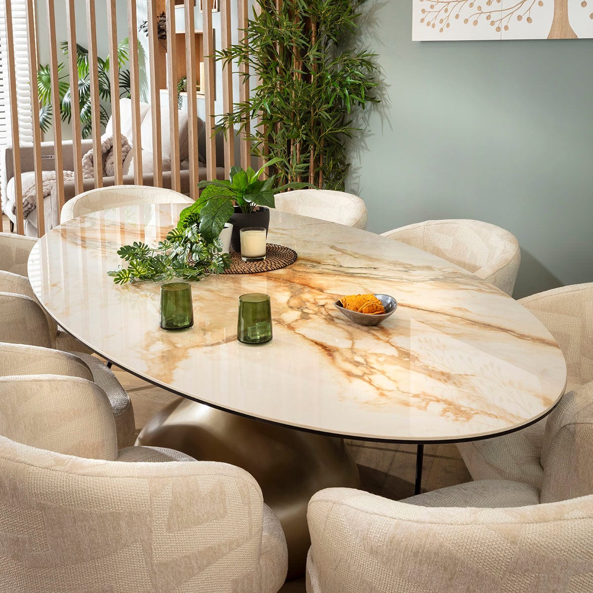 The Venusia 8 seater dining table features an elegant oval shape top, spanning an impressive 240cm x 120cm. The luxury marble-effect surface pairs with a unique tear-drop pedestal base crafted from fibreglass and finished in champion gold, resulting in a bold, statement-making showstopper. The tabletop is crafted from premium white ceramic with a refined marble-effect design featuring subtle gold veining for a luxurious touch. Highly resistant to scratches, stains and heat, it effortlessly supports busy everyday living. Built from exceptional materials throughout, this piece offers long-lasting durability without compromising on elegance or practicality.