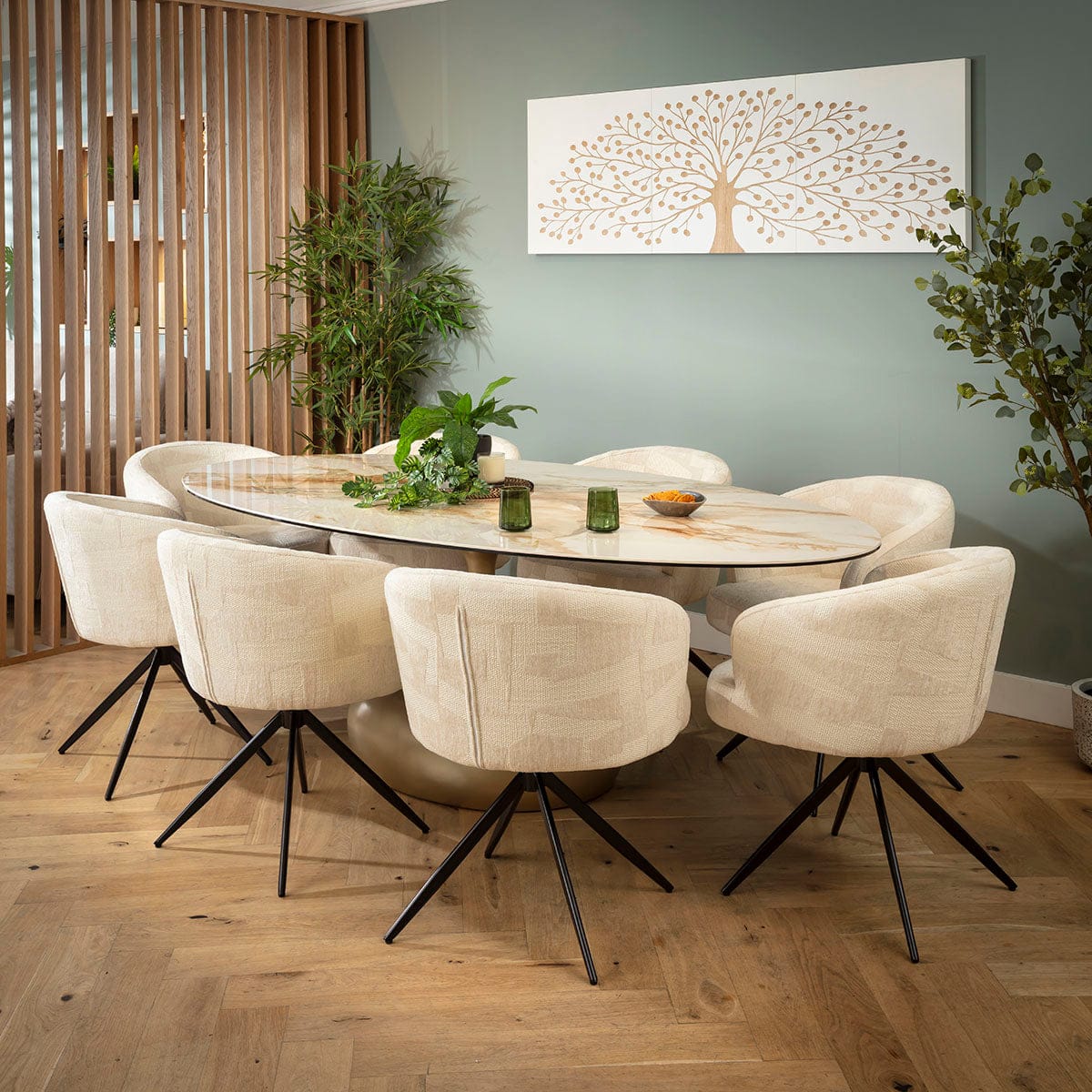 This eight seater dining table and chair set includes a large oval shaped ceramic marble dining table adorned with a unique pedestal base in champion gold, with swivel dining chairs with arms that are upholstered in a unique cream fabric. This modern dining set is crafted for durability and comfort.
