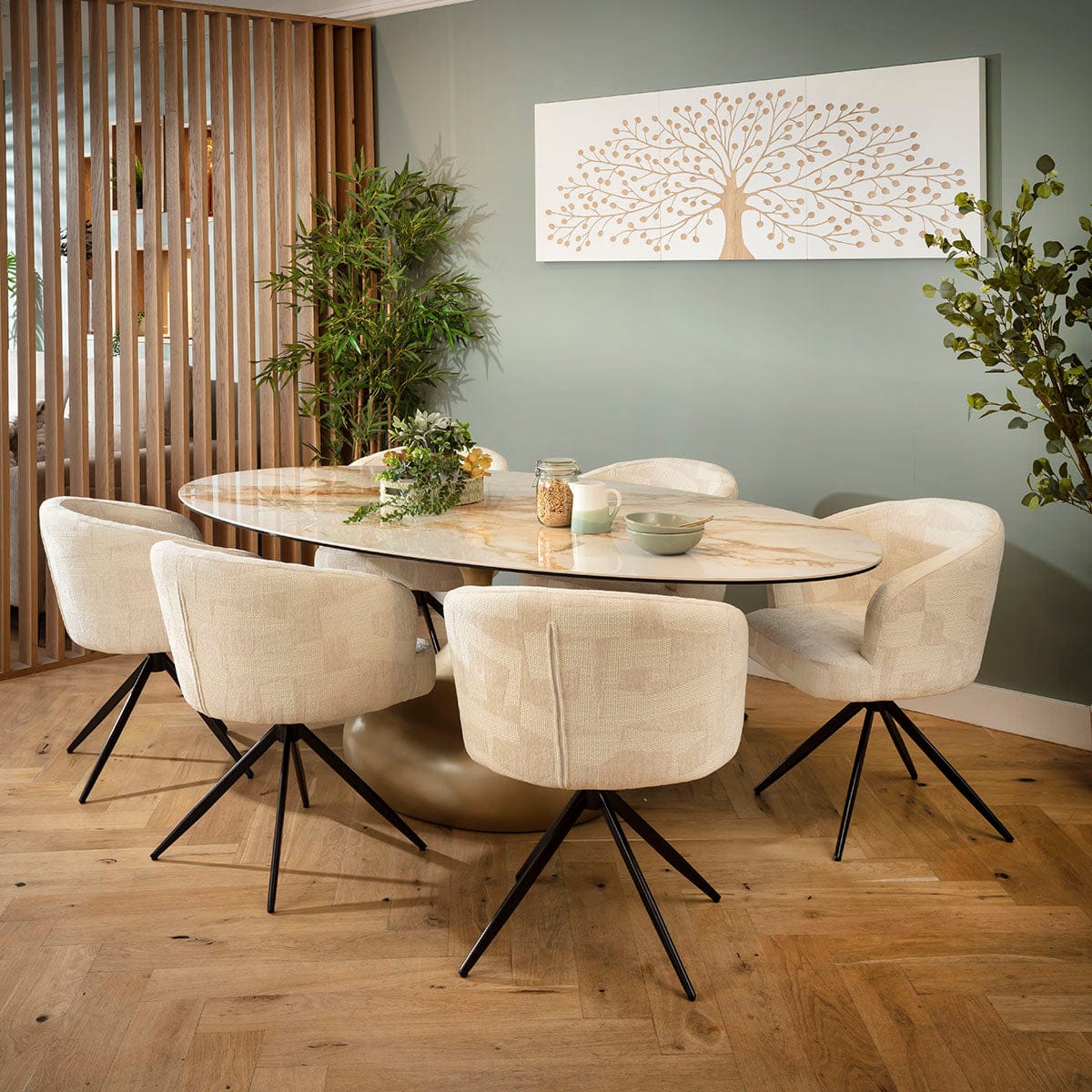 This 6 seater dining table and chair set includes a large oval-shaped ceramic marble dining table adorned with a unique pedestal base in champion gold, with swivel dining chairs with arms that are upholstered in a unique cream fabric. This modern dining set is crafted for durability and comfort.