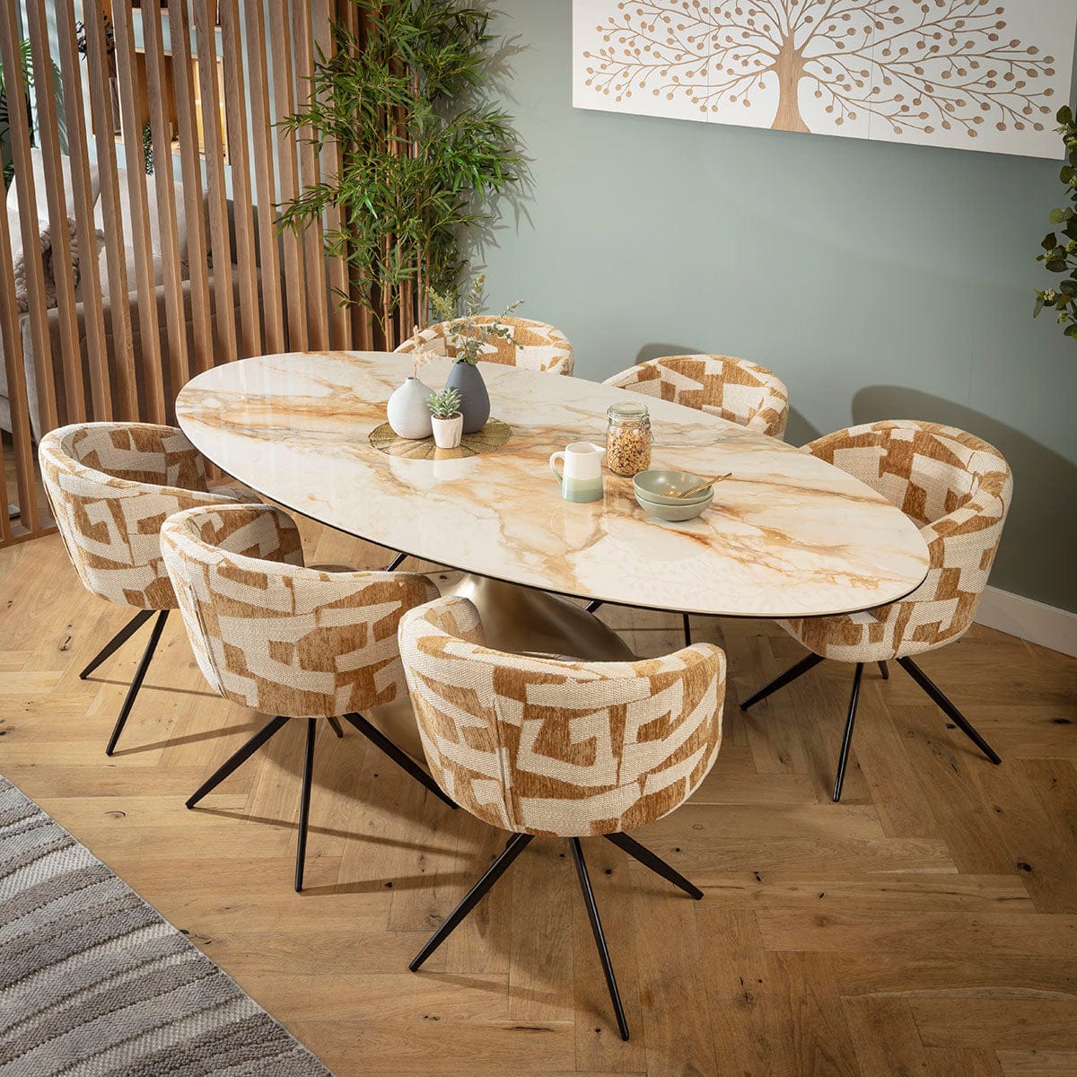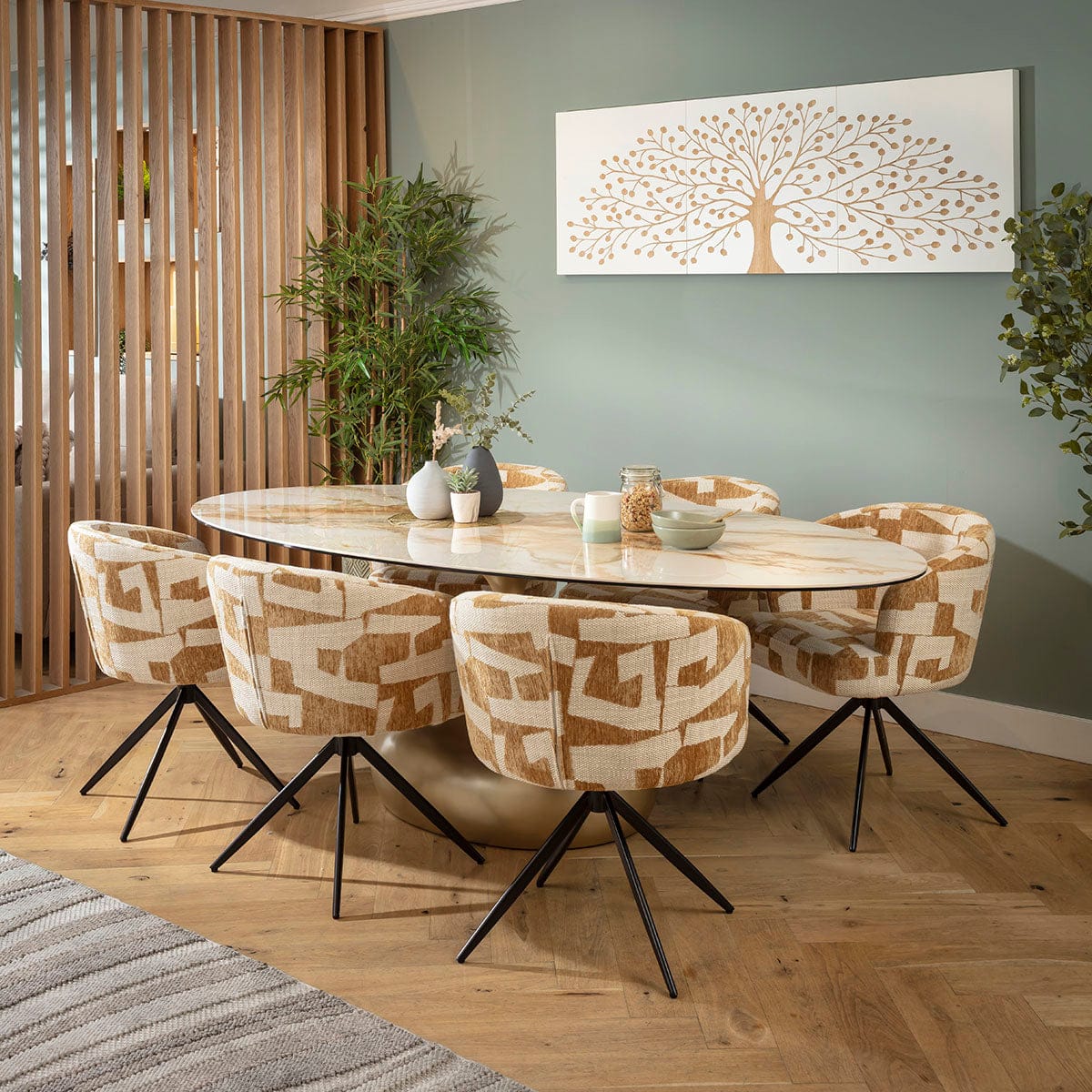 This 6 seater dining table and chair set includes a large oval-shaped ceramic marble dining table adorned with a unique pedestal base in champion gold, with swivel dining chairs with arms that are upholstered in a distinctive yellow fabric. This modern dining set is crafted for durability and comfort.
