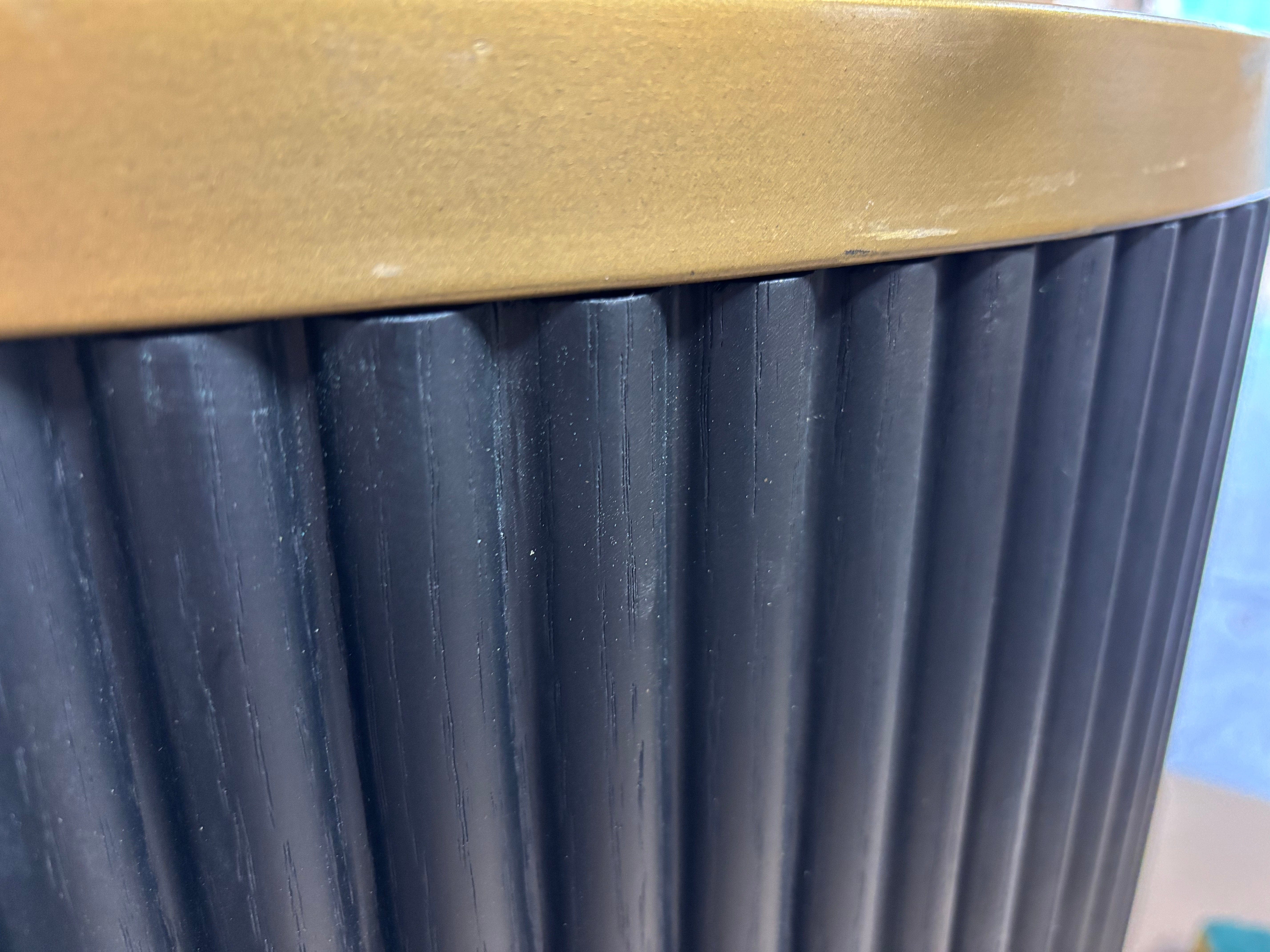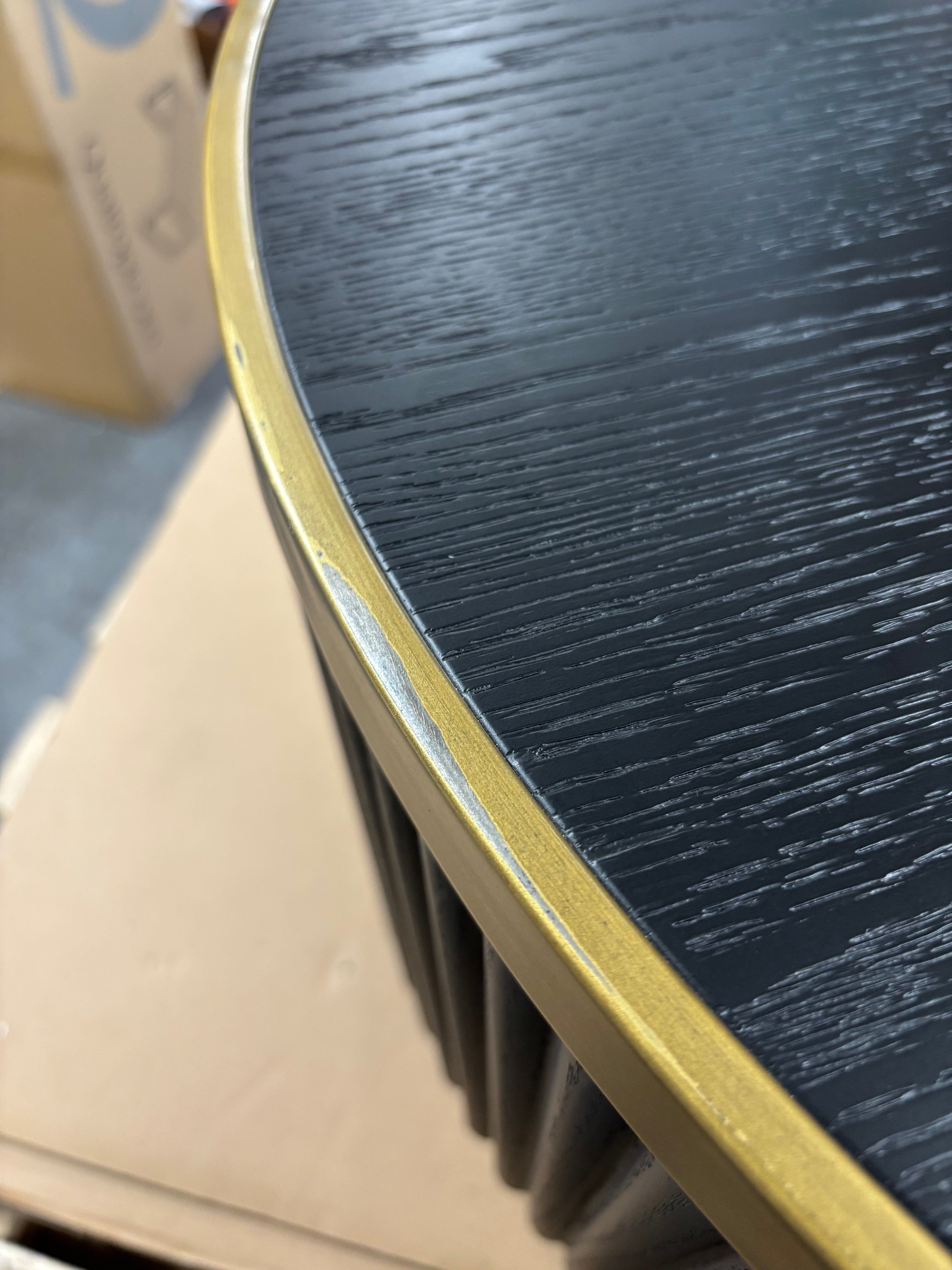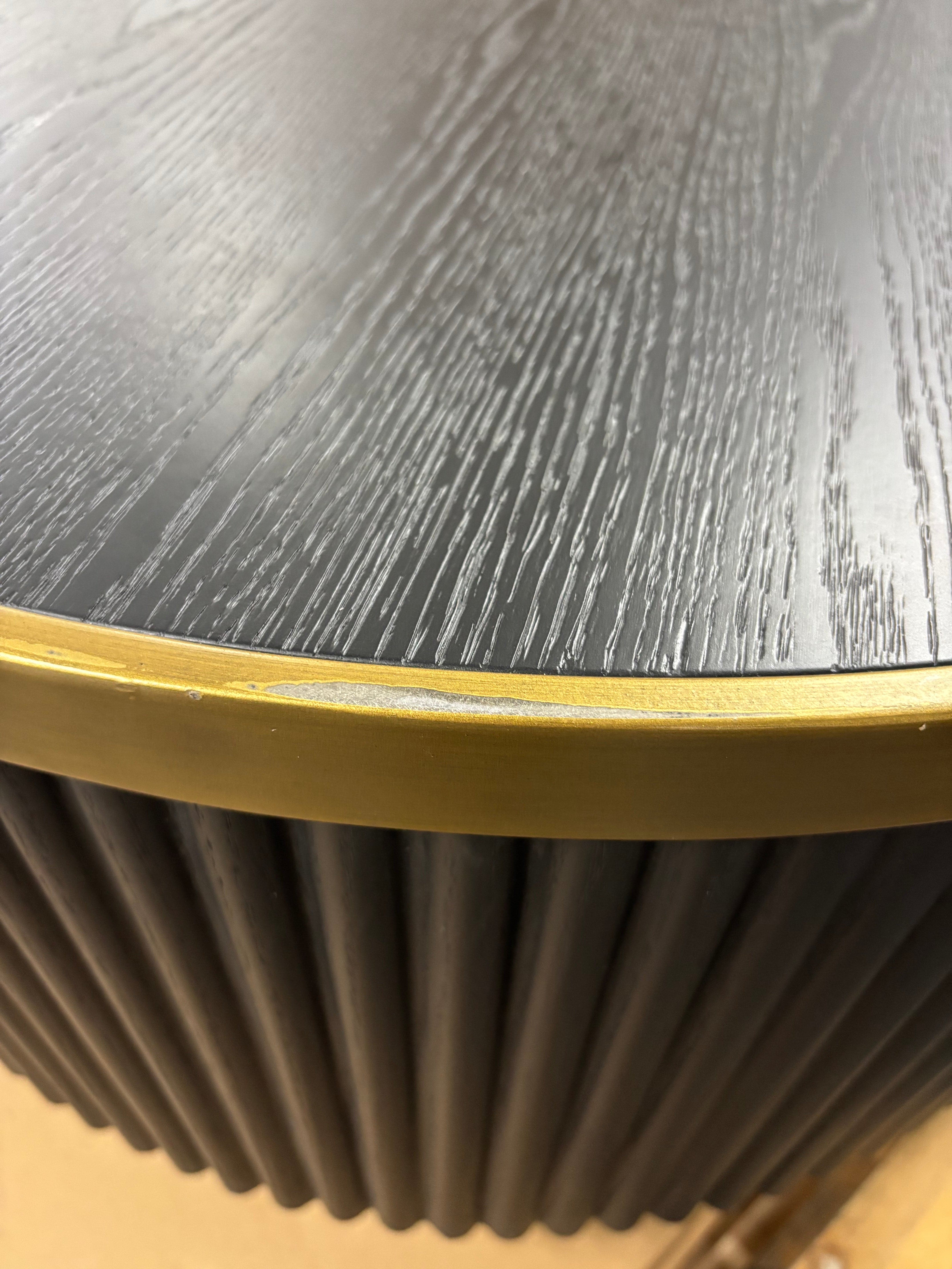 The first table in this dynamic duo features a ribbed fluted black oak body, exuding an air of sophistication and texture. Its sleek black oak veneer top not only adds a touch of elegance but also ensures durability. The brass-colored metal accents beautifully complement the black oak, creating a striking visual contrast. Measuring at a compact 76cm in diameter, this smaller table is versatile and can be used as an individual statement piece or nested with its counterpart.