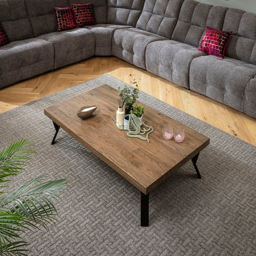 Crafted with a thick reclaimed oak top, this wooden coffee table showcases bold industrial design with black painted metal legs. Its rustic brown surface highlights the natural deep grain, giving every piece a tactile charm. As a dark wood coffee table, it brings warmth and strength, making a true statement in contemporary interiors.