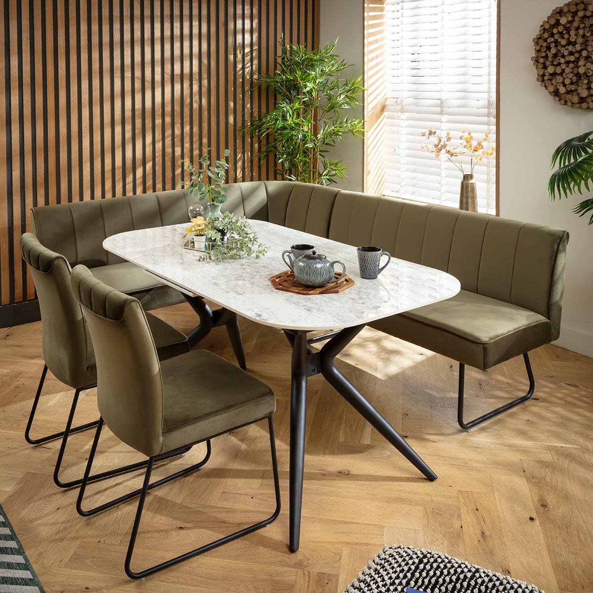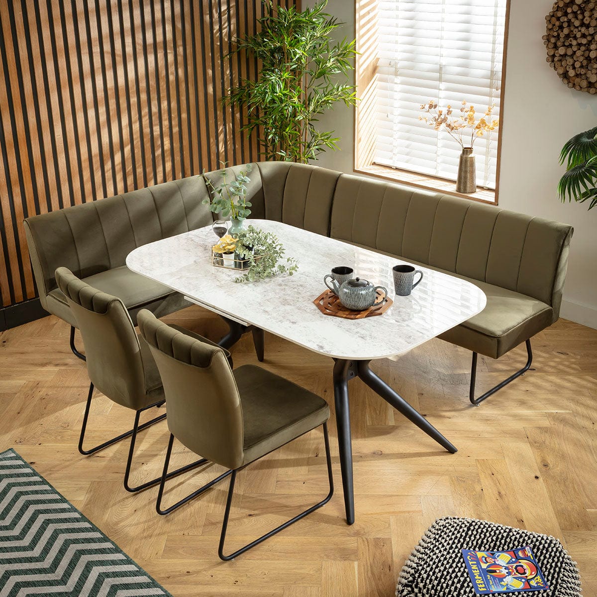 This 7 seater corner bench dining set includes our modern extendable dining table, it has a premium grey ceramic marble top and metal legs, with a Deco corner dining bench and 2 dining chairs in premium green velvet upholstery. This corner dining set is crafted for practicality and comfort.