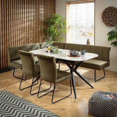 The Deco Corner Bench Dining Set is a versatile and stylish seating solution for any dining space. The corner bench can comfortably seat up to 5 people, with the 2 dining chairs making this a spacious 7 seater dining set. Kitchen dining benches offer a perfect gathering spot for friends and family. The premium olive green velvet upholstery is luxurious in its richness and vibrancy.