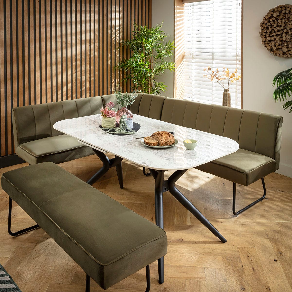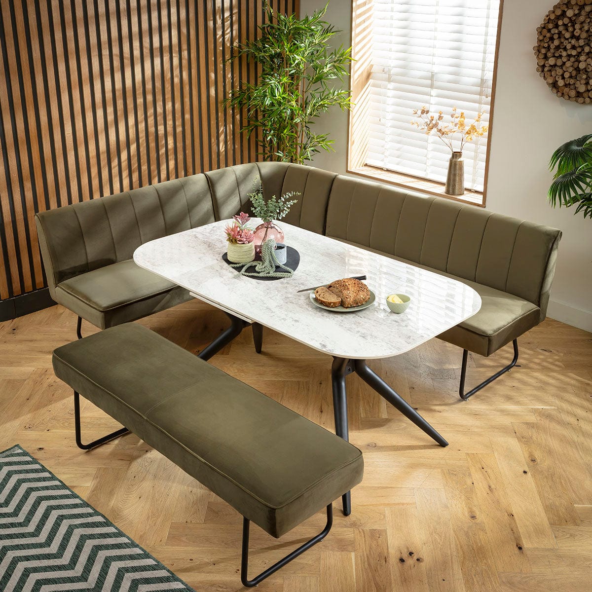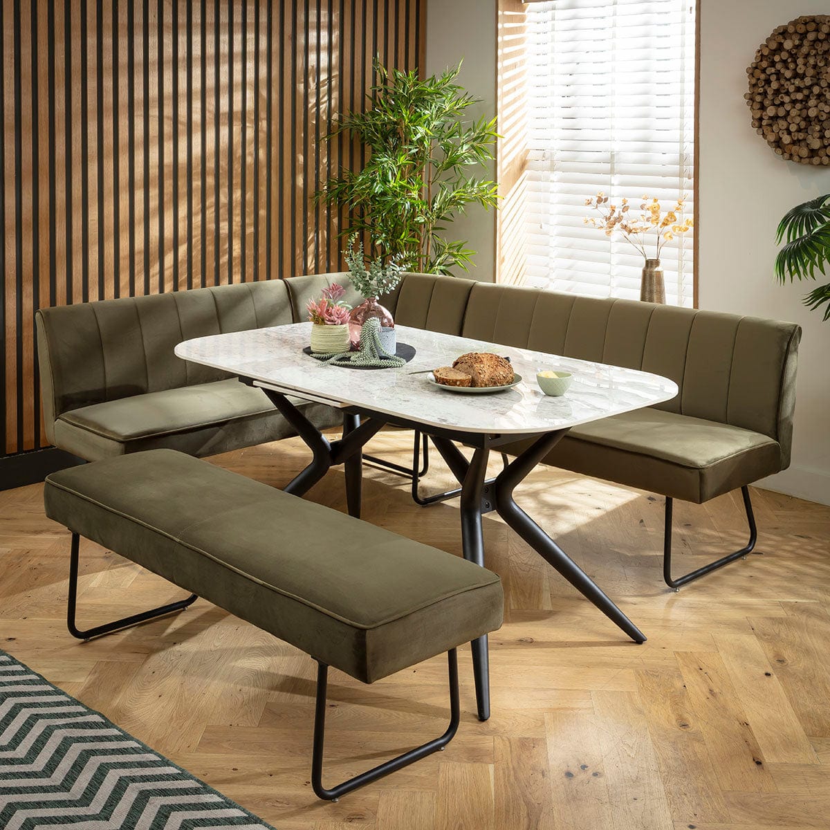 This 8 seater corner bench dining set includes our modern extendable dining table, it has a premium grey ceramic marble top and metal legs, with a Deco corner dining bench and a backless bench in premium green velvet upholstery. This corner dining set is crafted for practicality and comfort.