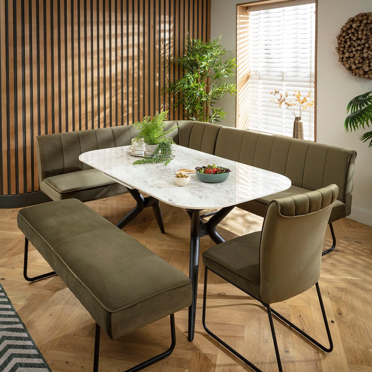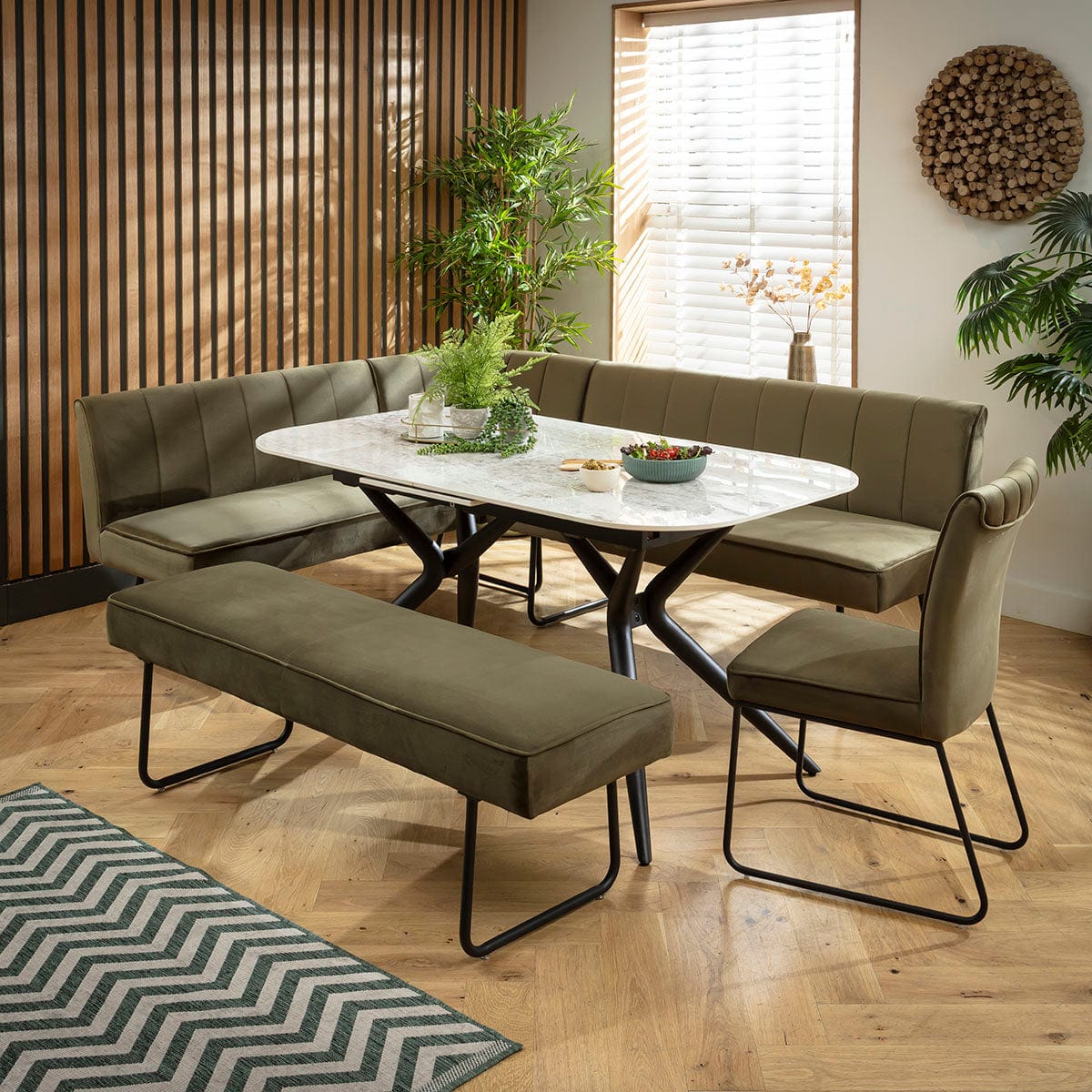 This 9 seater corner bench dining set includes our modern extendable dining table, it has a premium grey ceramic marble top and metal legs, with a Deco corner dining bench, backless bench and chair in green velvet upholstery. This corner dining set is crafted for practicality and comfort.
