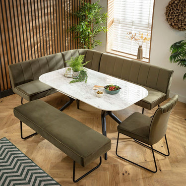 The Deco Corner Bench Dining Set is a versatile and stylish seating solution for any dining space. The corner bench can comfortably seat up to 5 people, with the 3 seater backless bench and chair making this a spacious 9 seater dining set. Kitchen dining benches offer a perfect gathering spot for friends and family. The premium olive green velvet upholstery is luxurious in its richness and vibrancy.