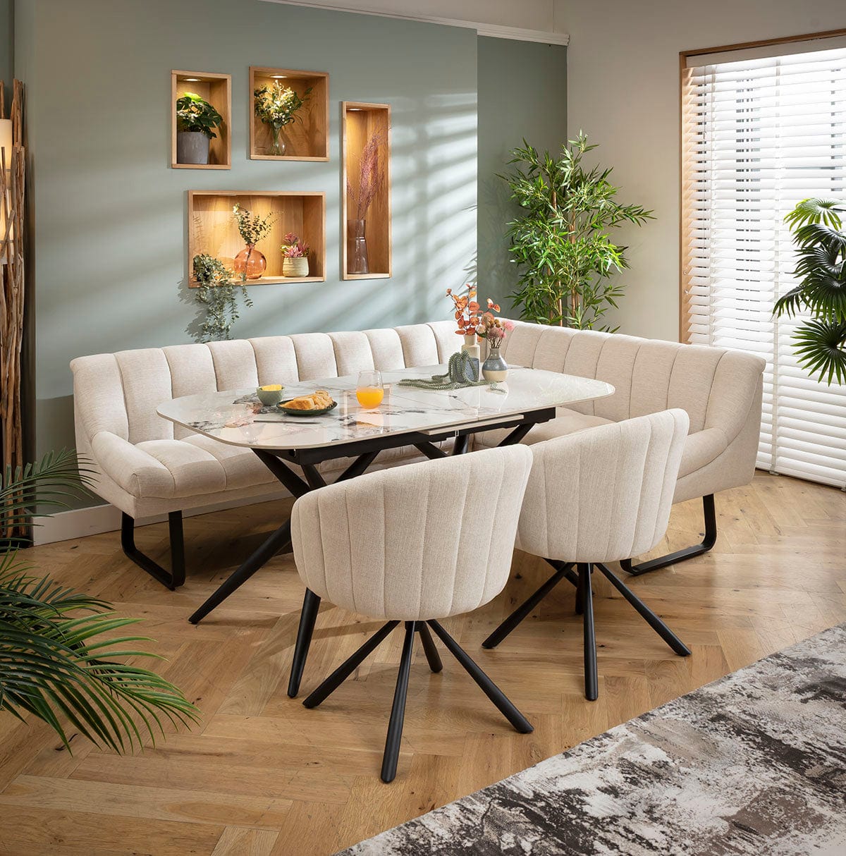 This 7 seater corner bench dining set includes our modern extending dining table, it has a luxury white gold ceramic marble top and metal legs, with a Harvey corner dining bench and 2 dining chairs in super-soft stone fabric. This corner dining set is crafted for practicality and comfort.