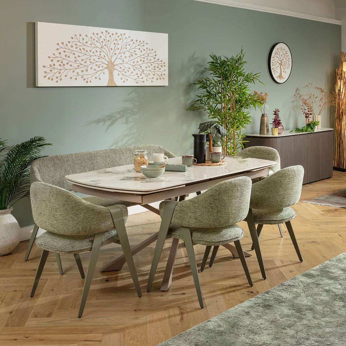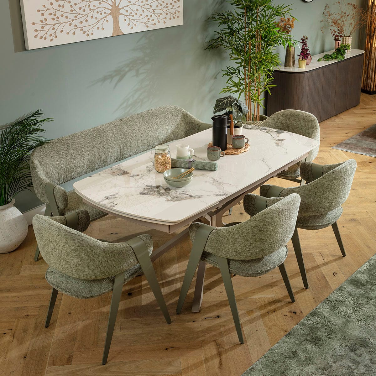This 7 seater bench dining set includes a marble-effect extendable dining table that blends style with expert engineering in beige and white, with a Freya dining bench featuring a supportive backrest, plus 4 chairs in super-soft green fabric. This modern dining set is crafted for practicality and comfort.