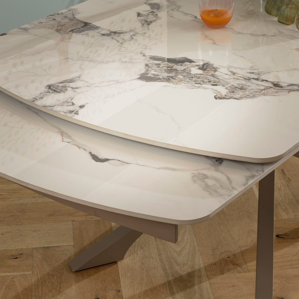 The large Olive extendable dining table features a unique colour palette, this piece showcases a white ceramic marble top with elegant veining and a smooth, polished finish. The ultra-durable ceramic resists scratches, stains and heat, while the beige-painted metal base introduces a distinctive modern silhouette. Rounded corners soften the form, and the generous 7 seat layout brings inviting versatility. Sized at 160cm × 90cm and extending to 200 or 240cm, the table uses pull-out leaves at each end, allowing either or both to be used without creating a centre gap. Premium ceramic and high-grade steel deliver lasting strength, reflecting our Quatropi quality promise.