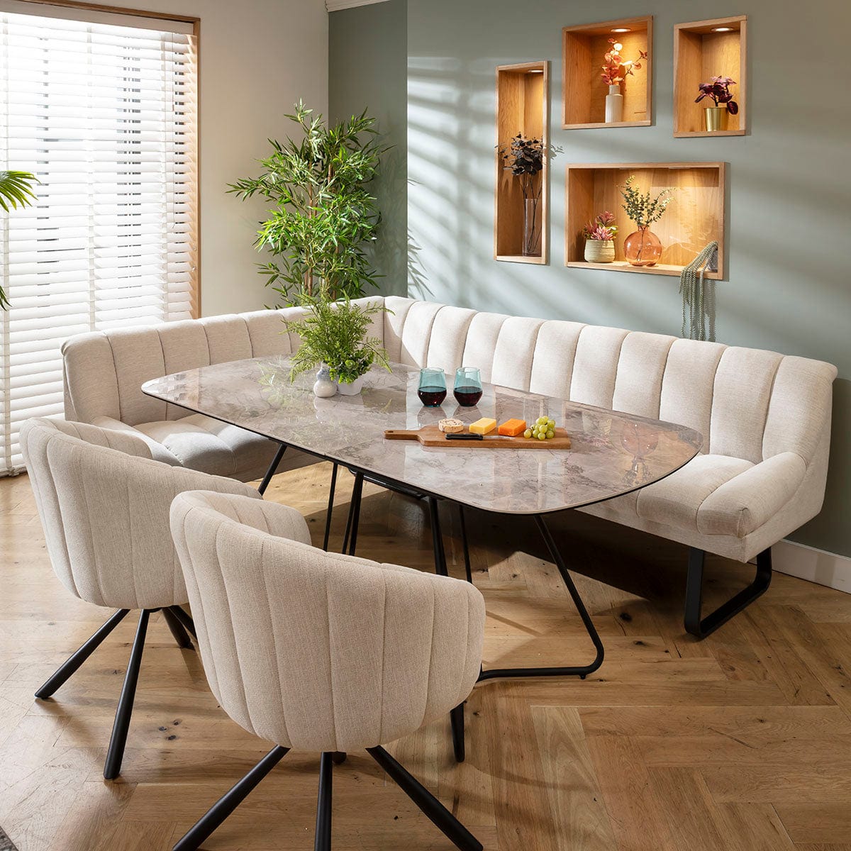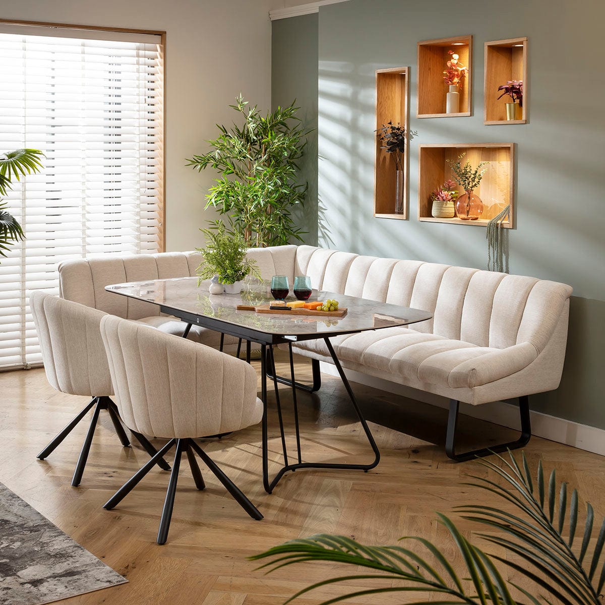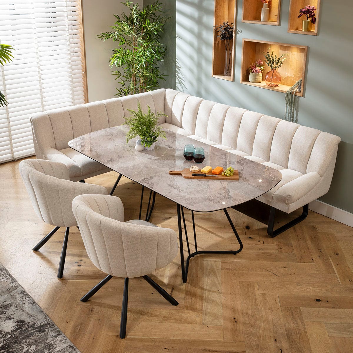 This 7 seater corner bench dining set includes an extendable dining table boasting a grey ceramic top with a glossy marble-effect finish, with a Harvey corner dining bench and 2 dining chairs in super-soft stone fabric. This corner dining set is crafted for practicality and comfort.