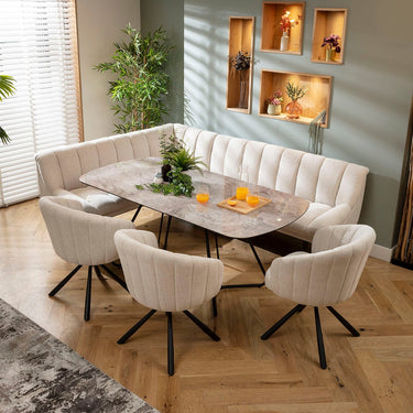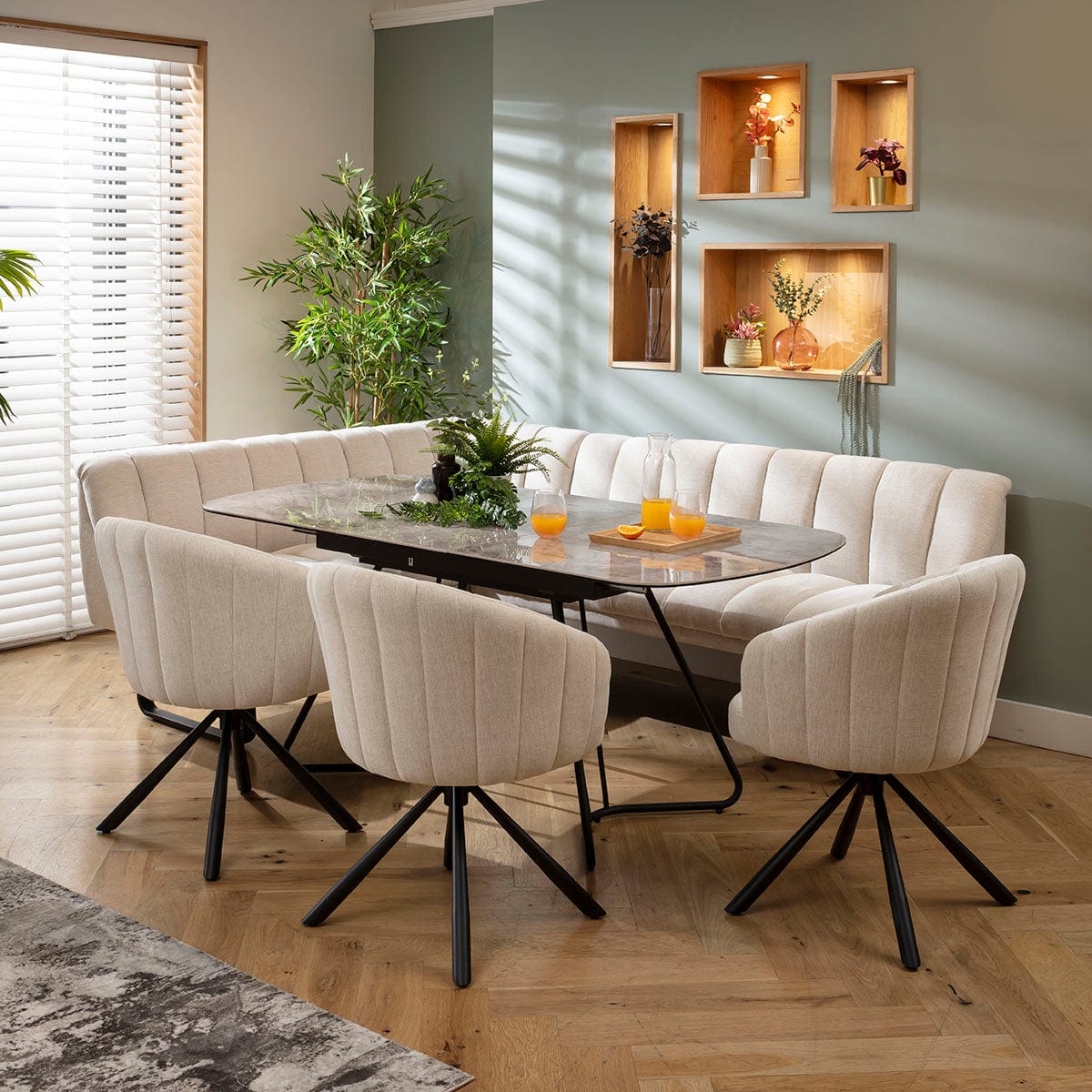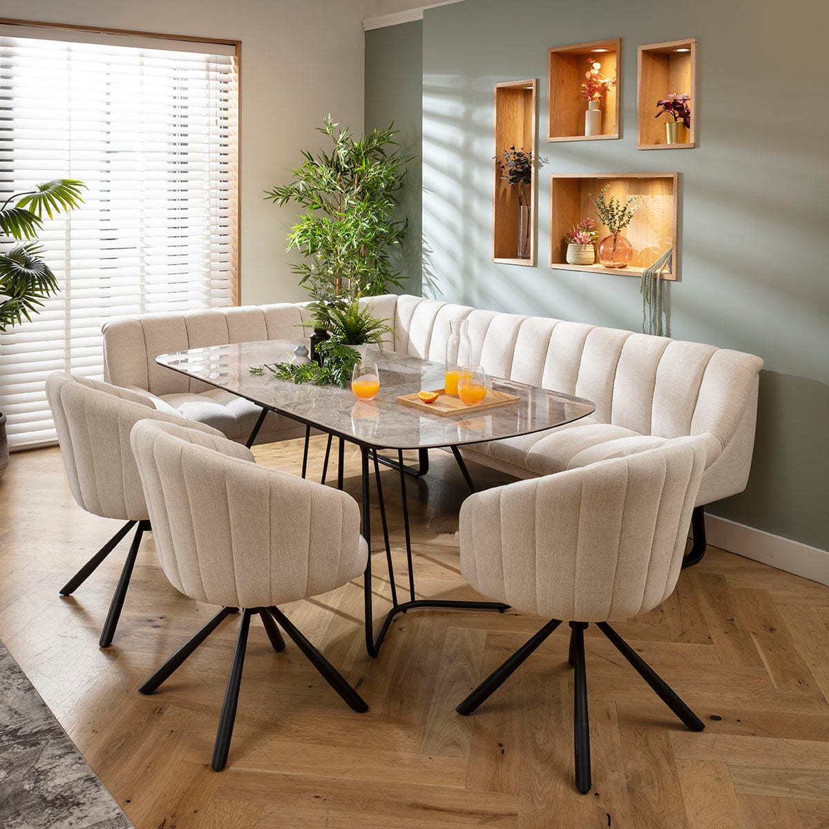 This 8 seater corner bench dining set includes an extendable dining table boasting a grey ceramic top with a glossy marble-effect finish, with a Harvey corner dining bench and 3 dining chairs in super-soft stone fabric. This corner dining set is crafted for practicality and comfort.