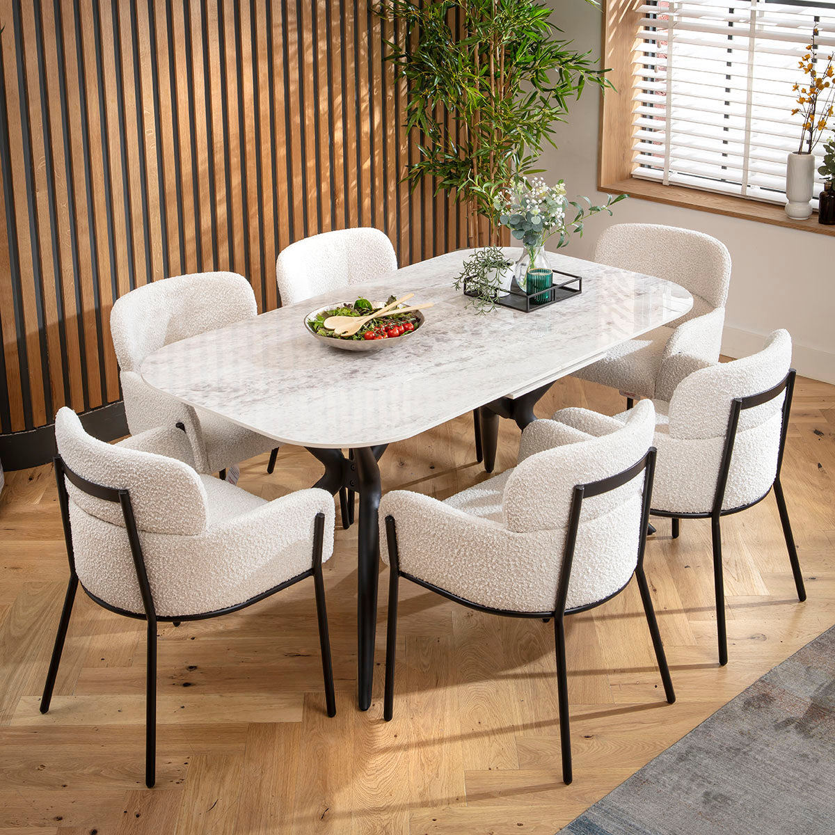 This contemporary dining table showcases a striking design with rounded corners for a softer look and a unique powder-coated black metal base. The bold yet sleek style ensures it fits beautifully in compact spaces while offering a large dining experience. Perfect for those who love modern elegance.