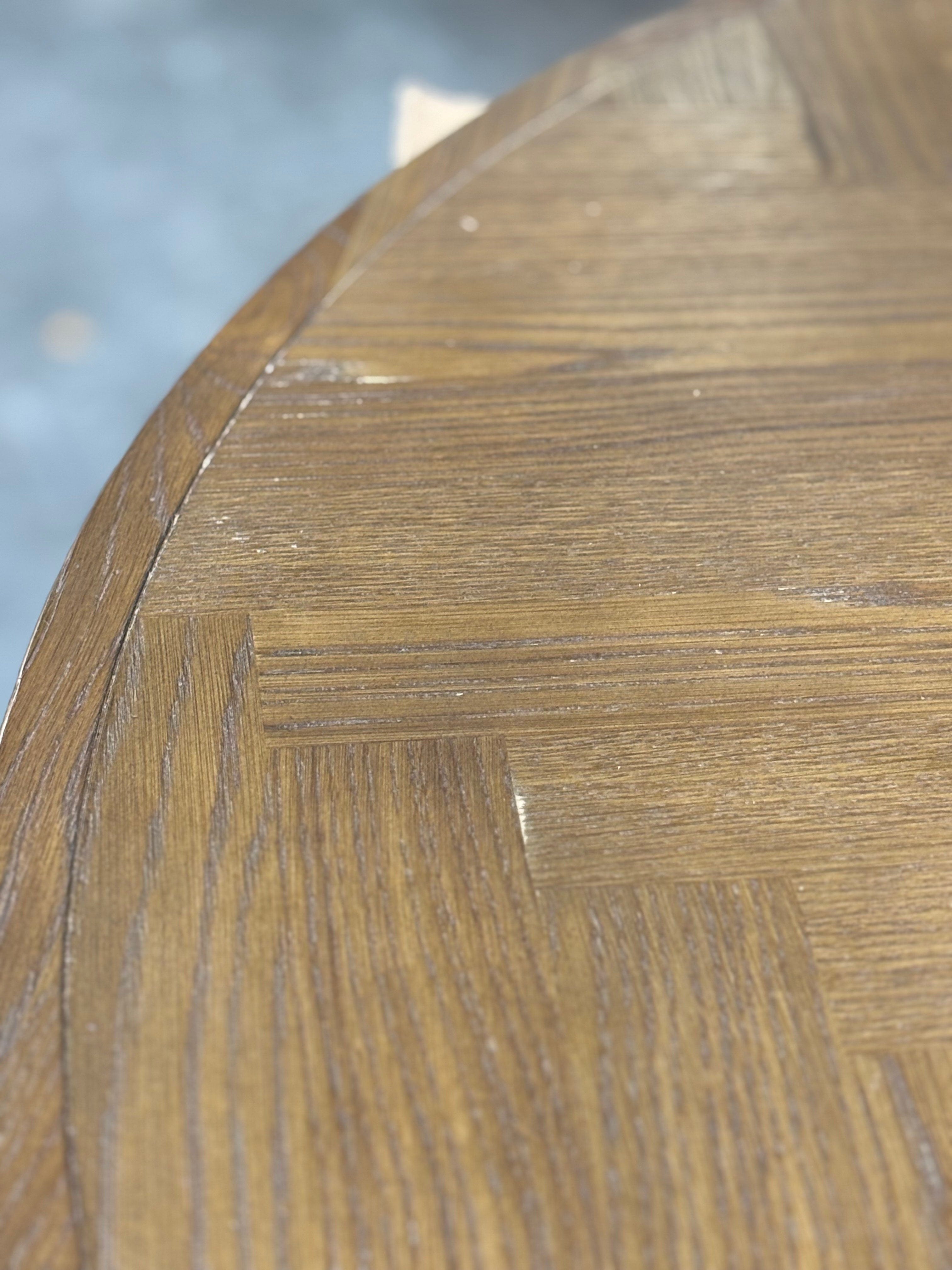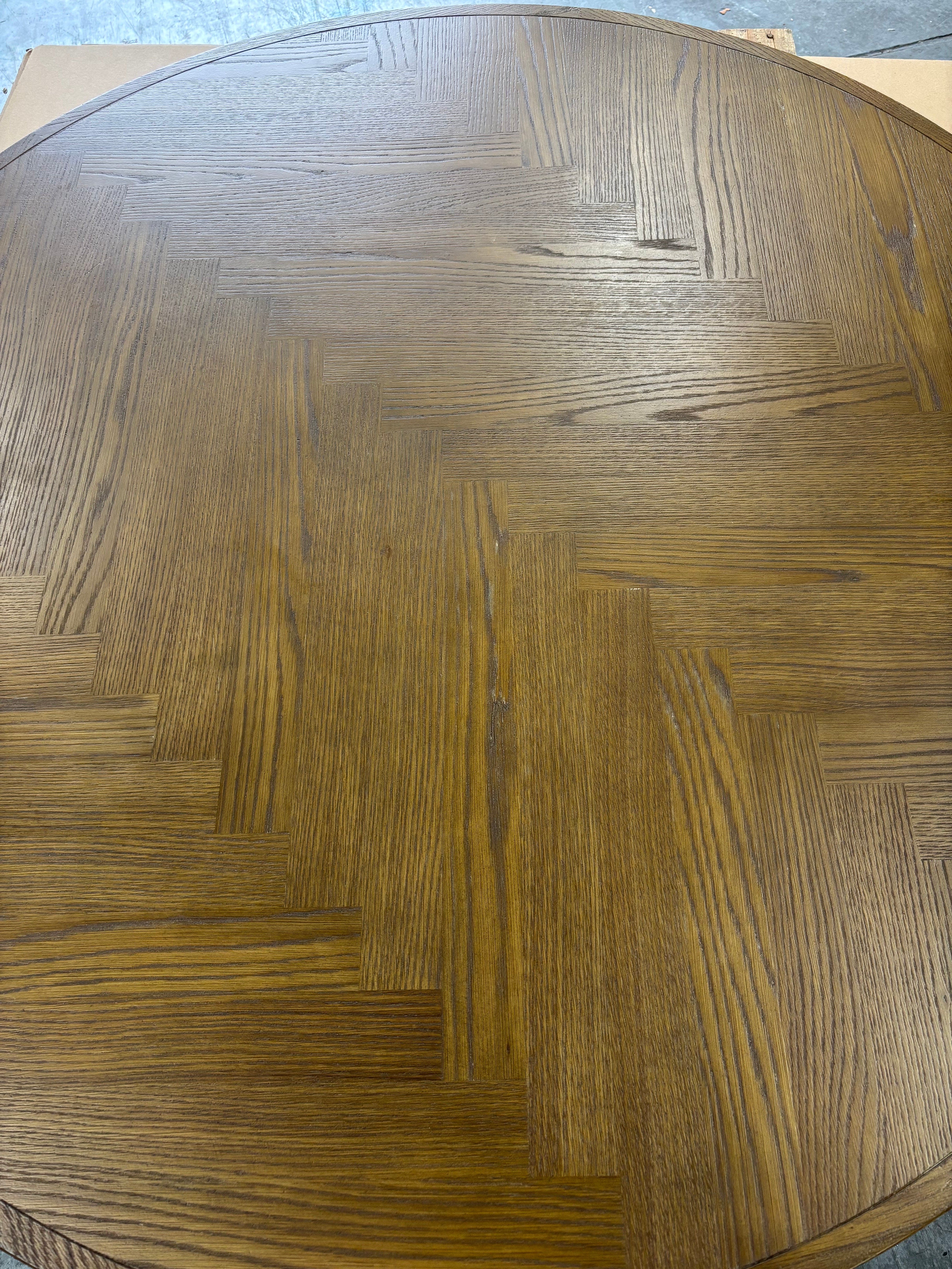 Its standout feature lies in the parquet herringbone pattern adorning the tabletop, exquisitely finished with a premium stain, elevating the ambiance of any dining space. The blend of solid wood and oak veneer ensures lasting quality, while the circular design provides ample room for hosting gatherings and meals with friends and family.