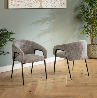 The Peyton dining chair showcases a modern silhouette with mouse grey fabric upholstery in a soft, hardwearing finish. Its carver design with arms, low-profile back and supportive 48cm seat height offer excellent comfort. Completed with a black metal frame featuring a unique arm cut-out and slim legs, it delivers a fresh, contemporary shape ideal for modern interiors.
