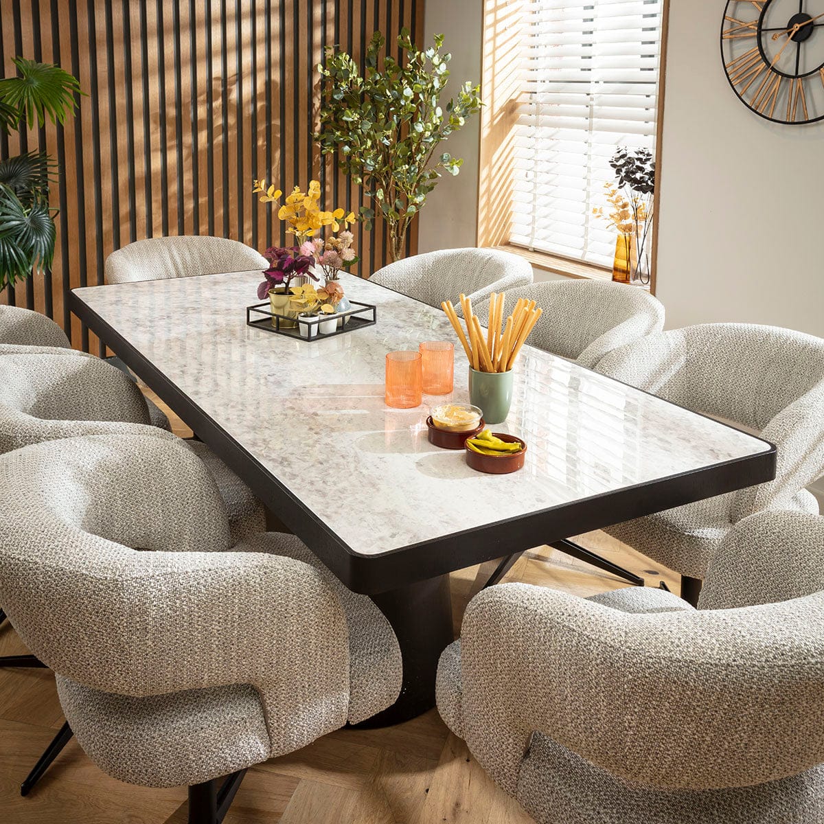 This 8 seater dining table and chair set includes a contemporary dining table crafted from premium black oak and grey marble-effect ceramic, with modern swivel dining chairs boasting Scandi design and durability in grey woven fabric. This modern dining set is crafted for durability and comfort.