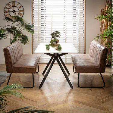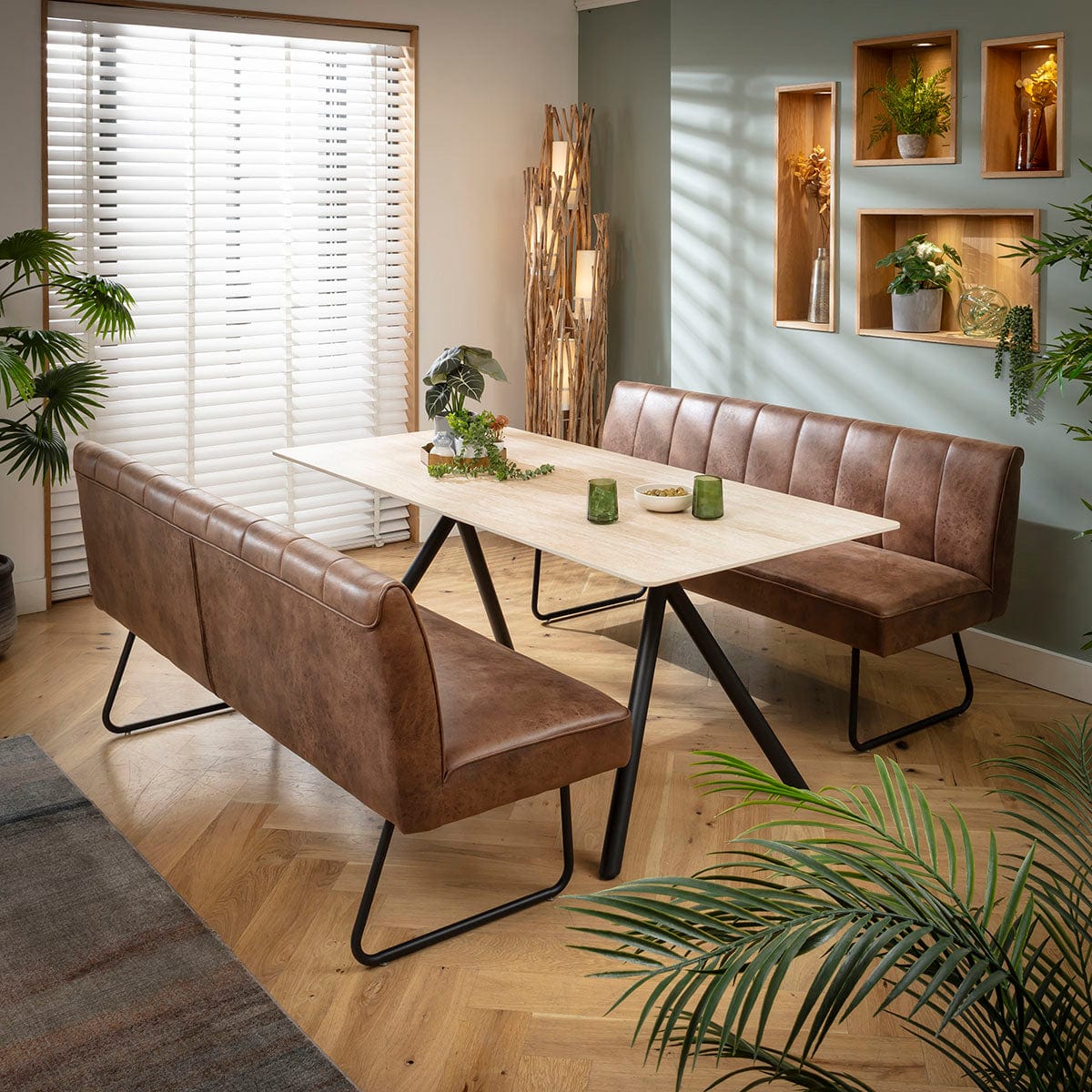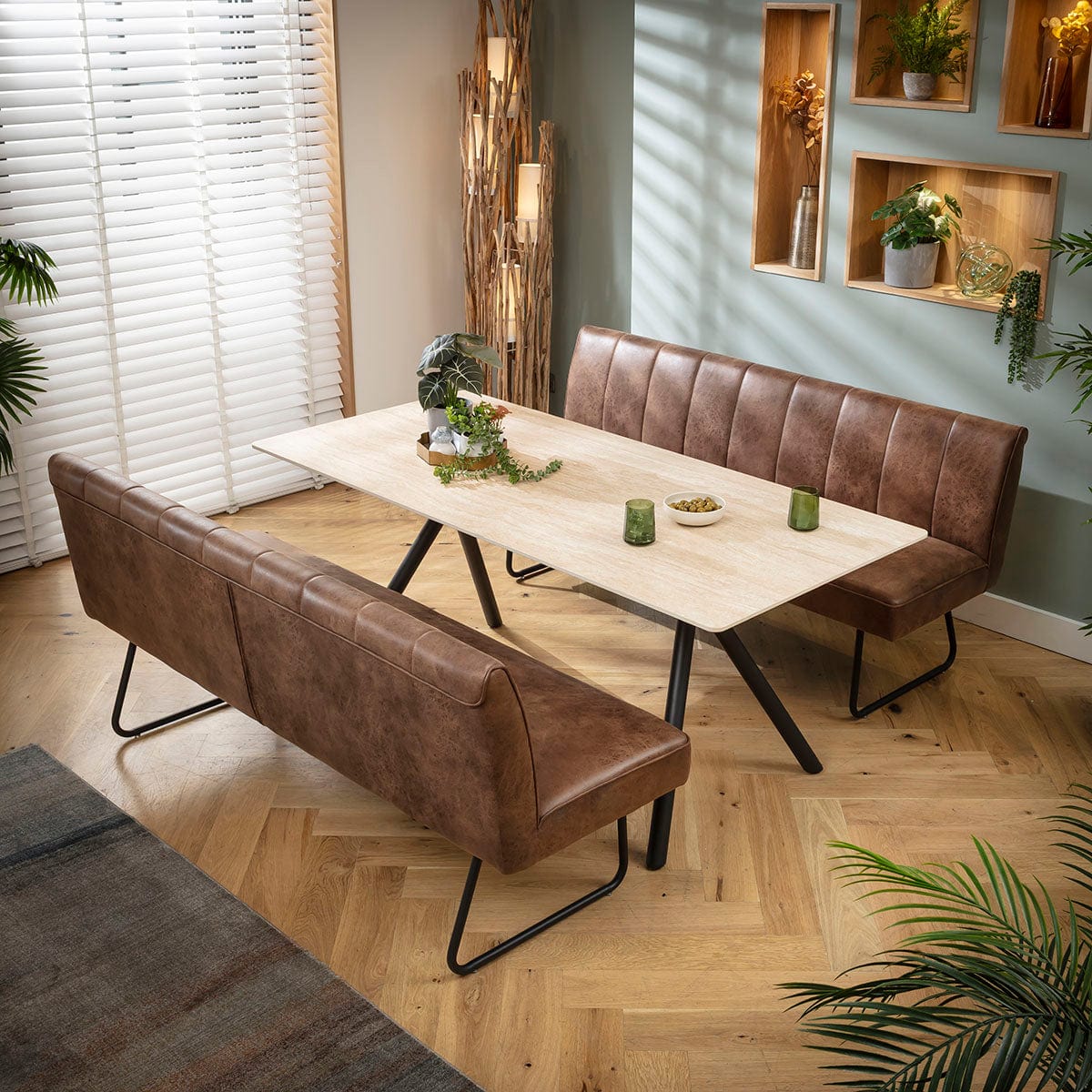 This 6 seater bench dining set includes a large dining table with premium stone beige marble-effect ceramic top and black metal legs, with two luxury Deco dining benches with backrests in premium antique brown leather-look upholstery. This modern dining set is crafted for practicality and comfort.