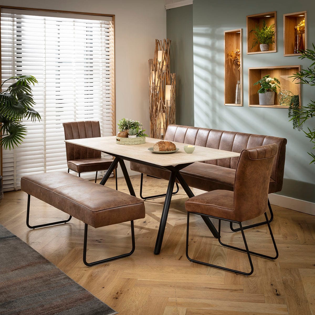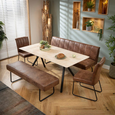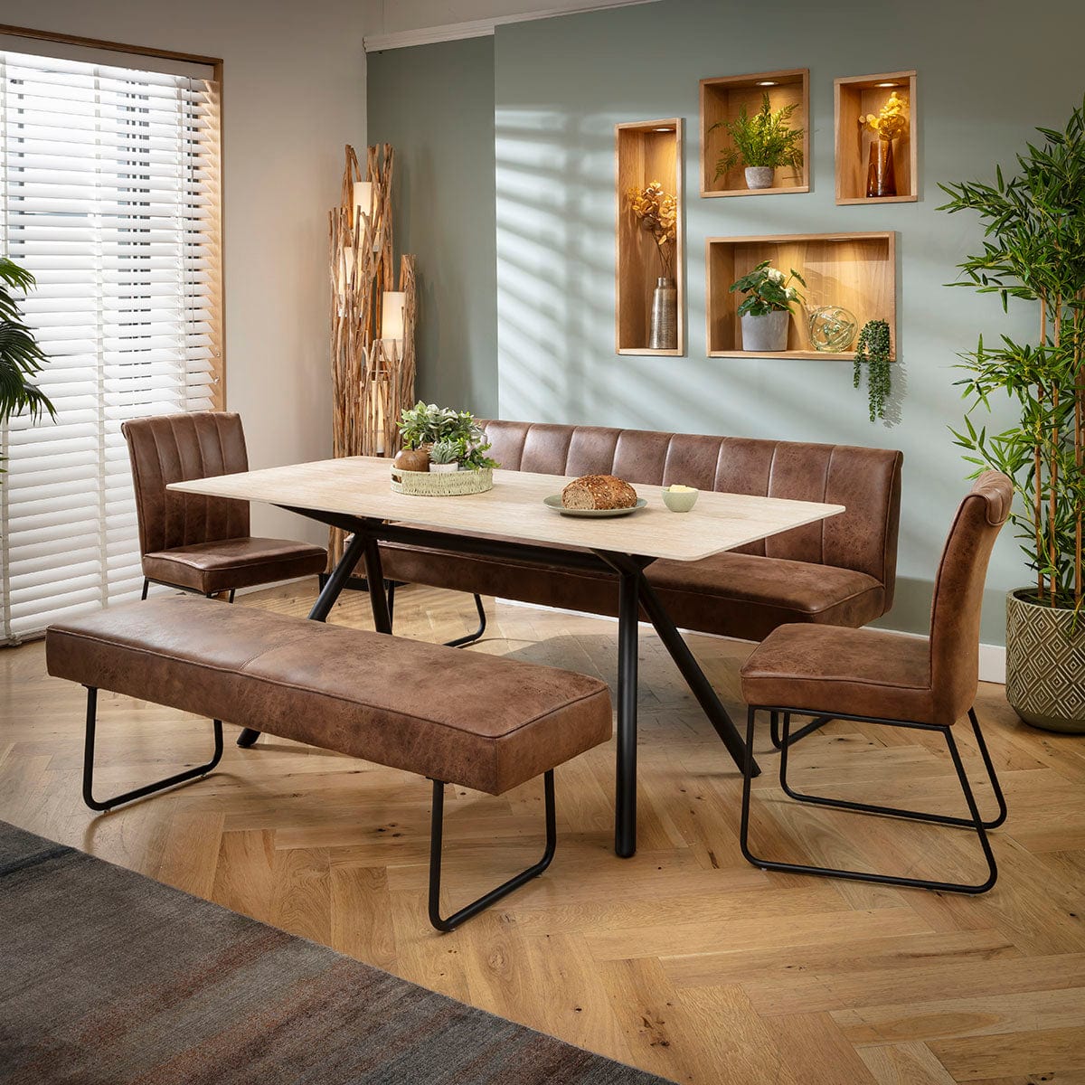This 8 seater bench dining set includes a large dining table with premium stone beige marble-effect ceramic top and black metal legs, with a backless bench, bench with a backrest and two chairs in antique brown leather-look upholstery. This modern dining set is crafted for practicality and comfort.