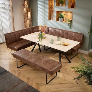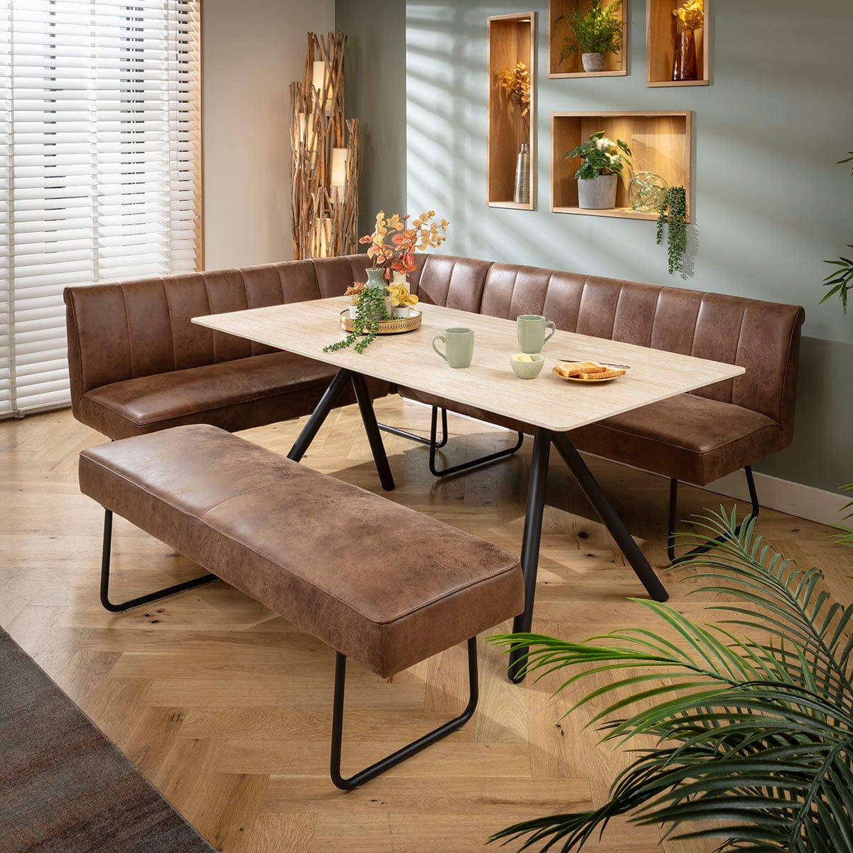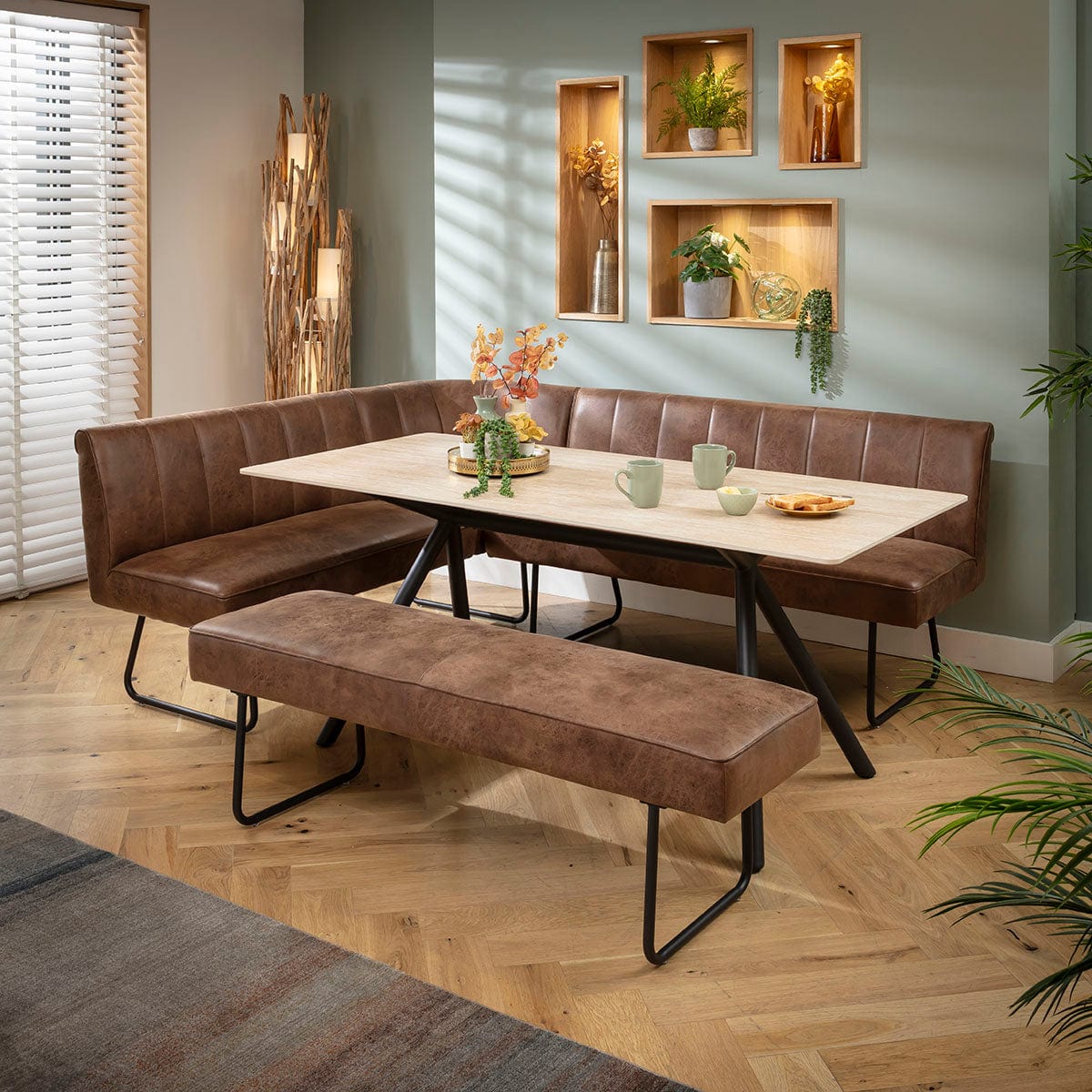 This 8 seater corner bench dining set includes a large dining table with premium stone beige marble-effect ceramic top and black metal legs, with a Deco corner dining bench and a backless bench in premium antique brown leather-look upholstery. This corner dining set is crafted for practicality and comfort.
