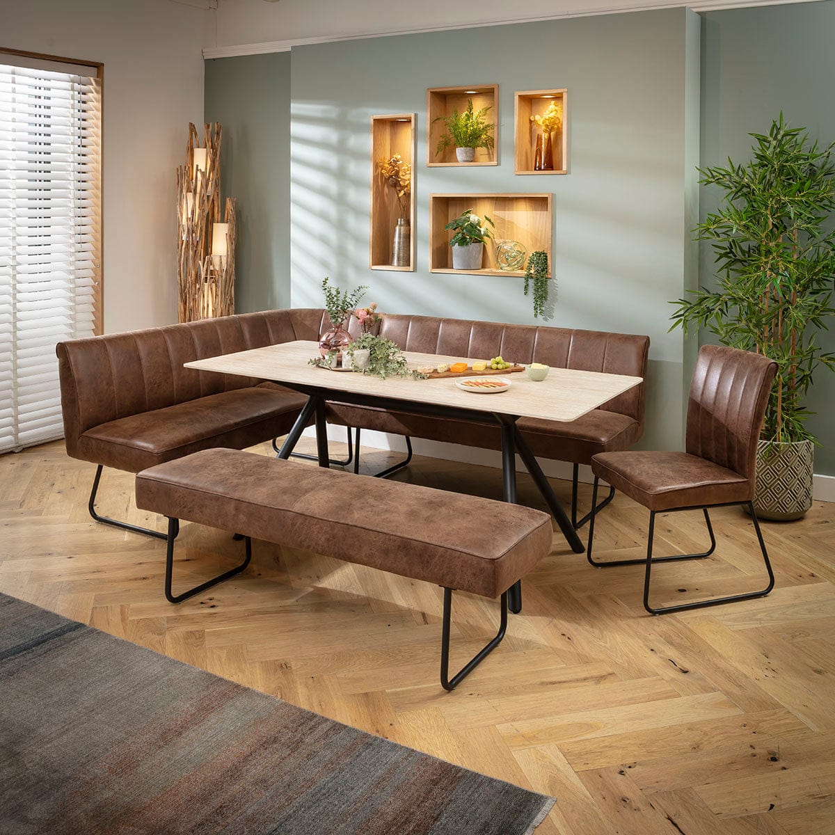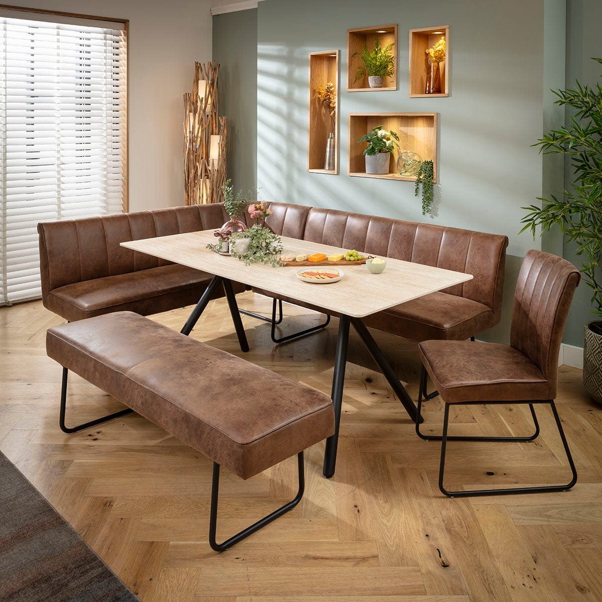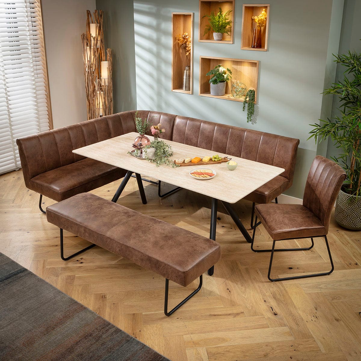 This 9 seater corner bench dining set includes a large dining table with premium stone beige marble-effect ceramic top and black metal legs, with a Deco corner dining bench, backless bench and chair in antique brown leather-look upholstery. This corner dining set is crafted for practicality and comfort.