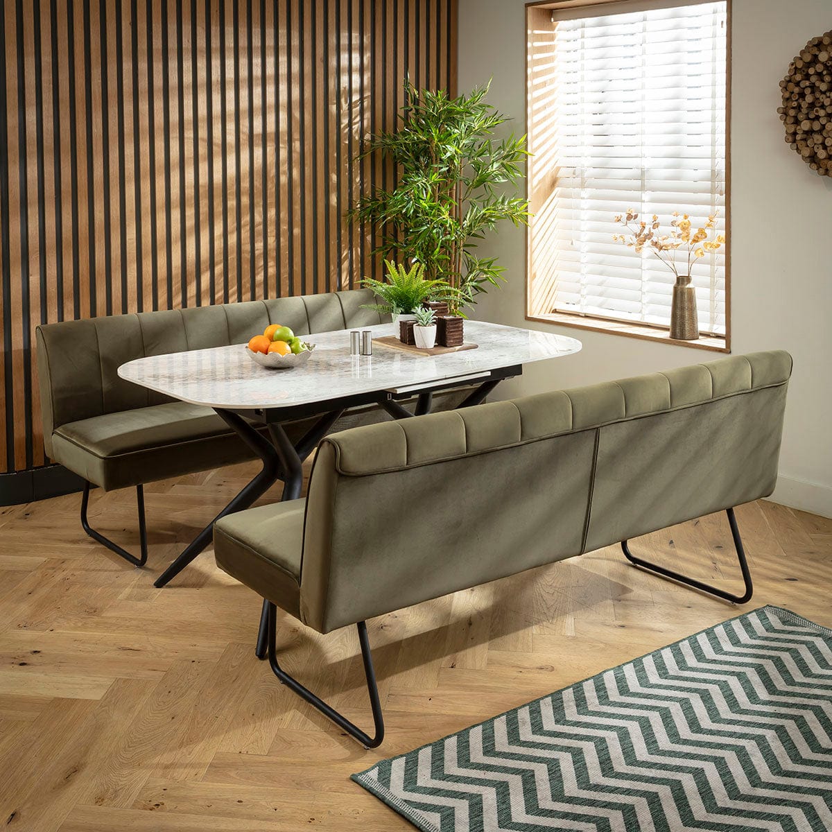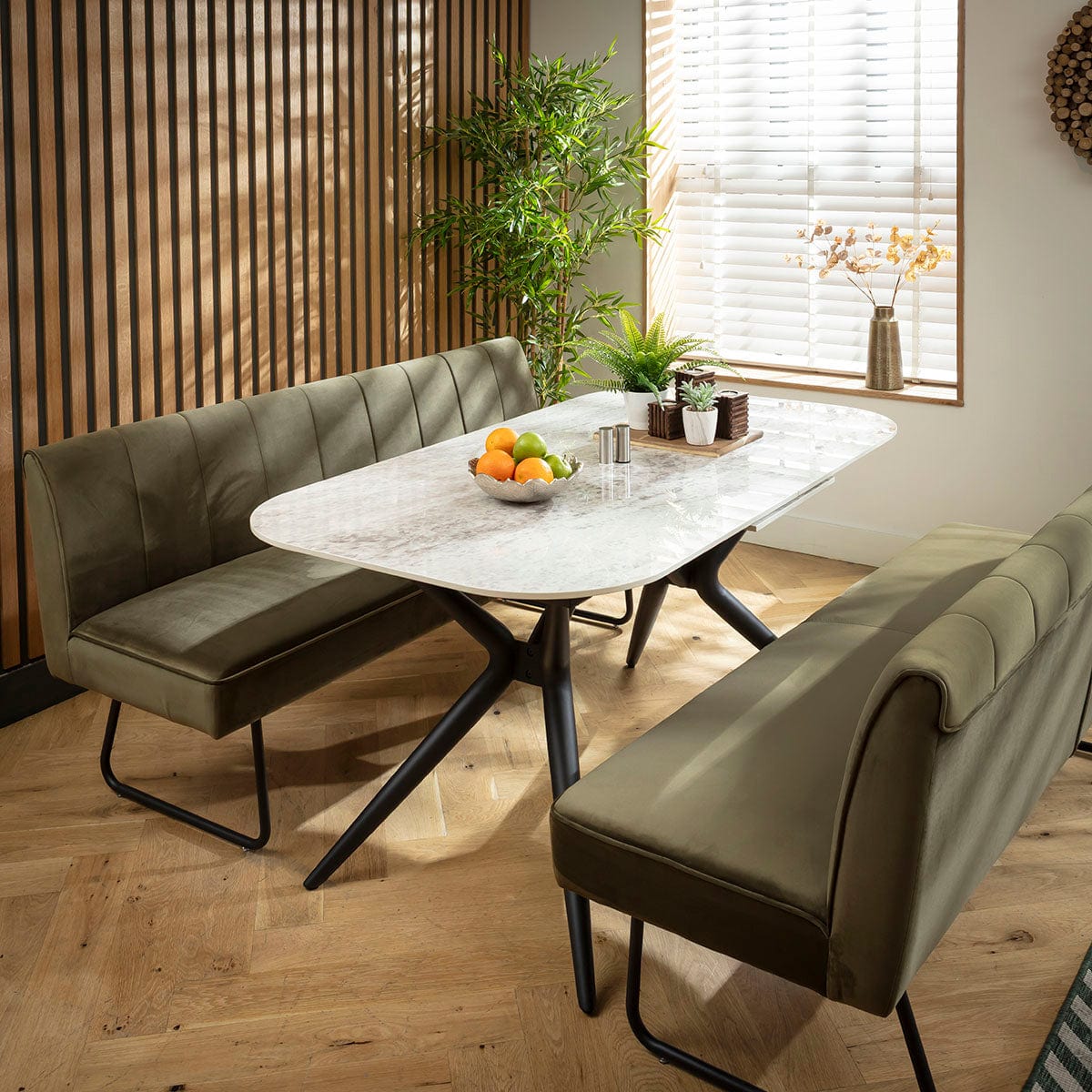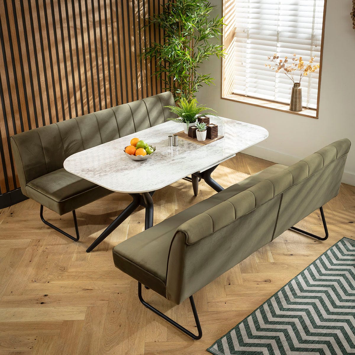 This 6 seater bench dining set includes our modern extendable dining table, it has a premium grey ceramic marble top and metal legs, with two luxury Deco dining benches with backrests in premium green velvet upholstery. This modern dining set is crafted for practicality and comfort.