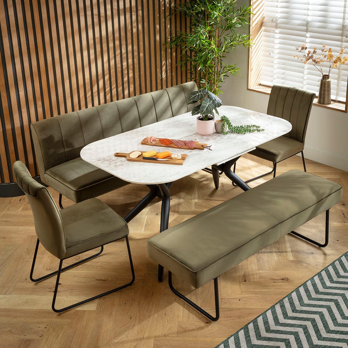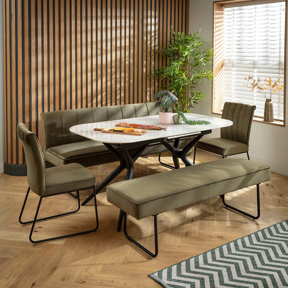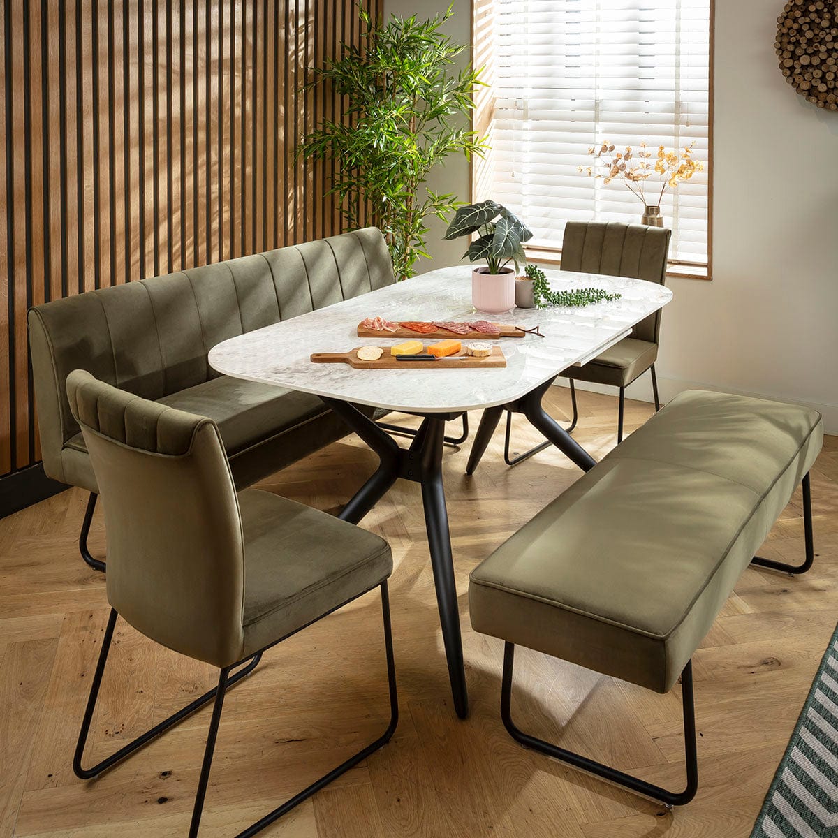 This 8 seater bench dining set includes our modern extendable dining table, it has a premium grey ceramic marble top and metal legs, with a backless bench, bench with a backrest and two chairs in premium green velvet fabric. This modern dining set is crafted for practicality and comfort.