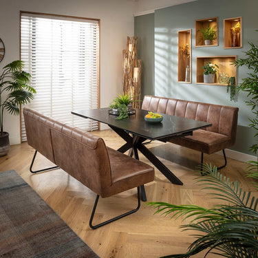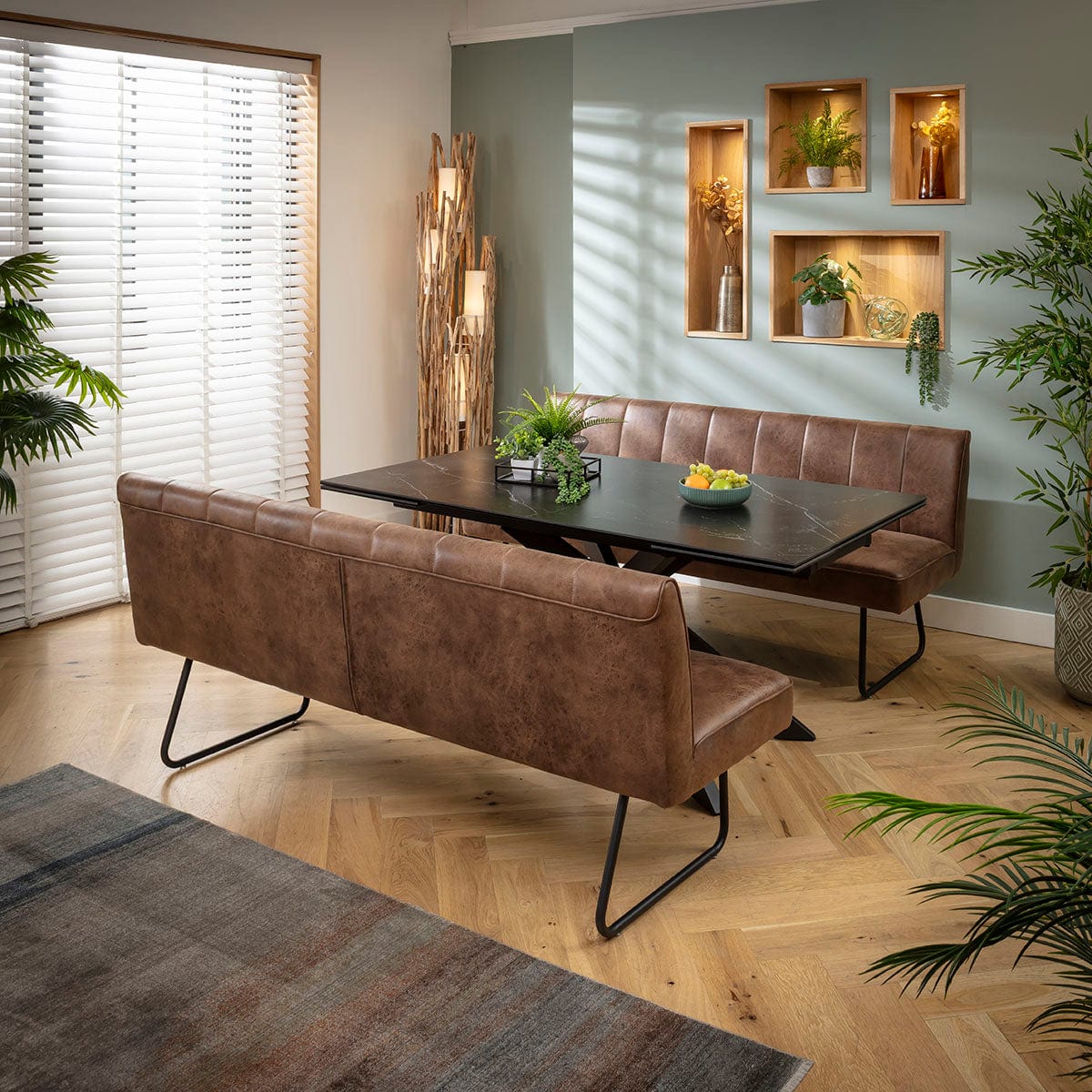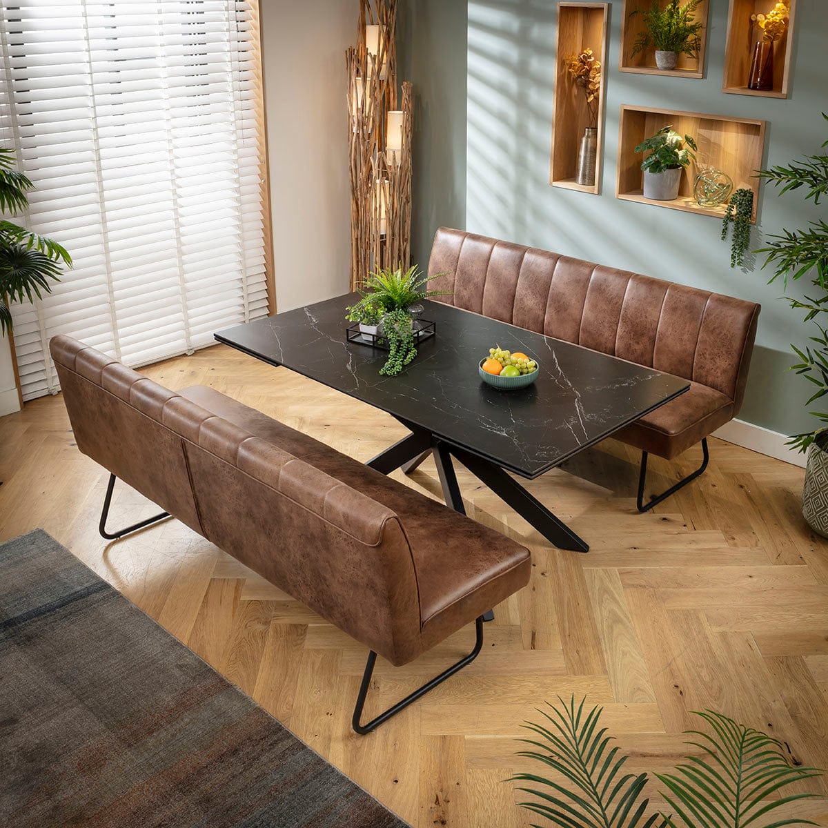 This 6 seater bench dining set includes our large designer ceramic marble extending dining table in black with no gap down the middle, with two luxury Deco dining benches with backrests in premium antique brown leather-look upholstery. This modern dining set is crafted for practicality and comfort.