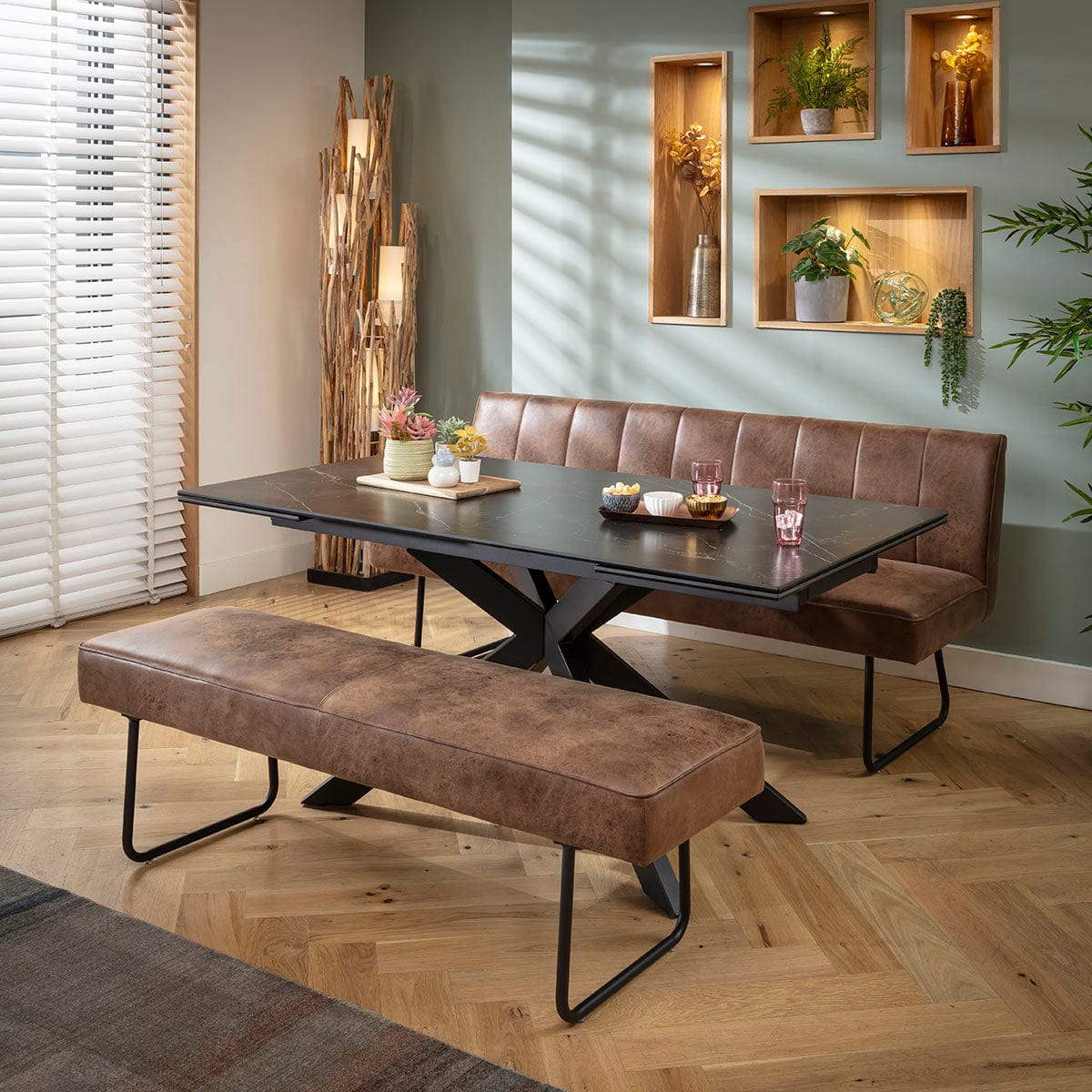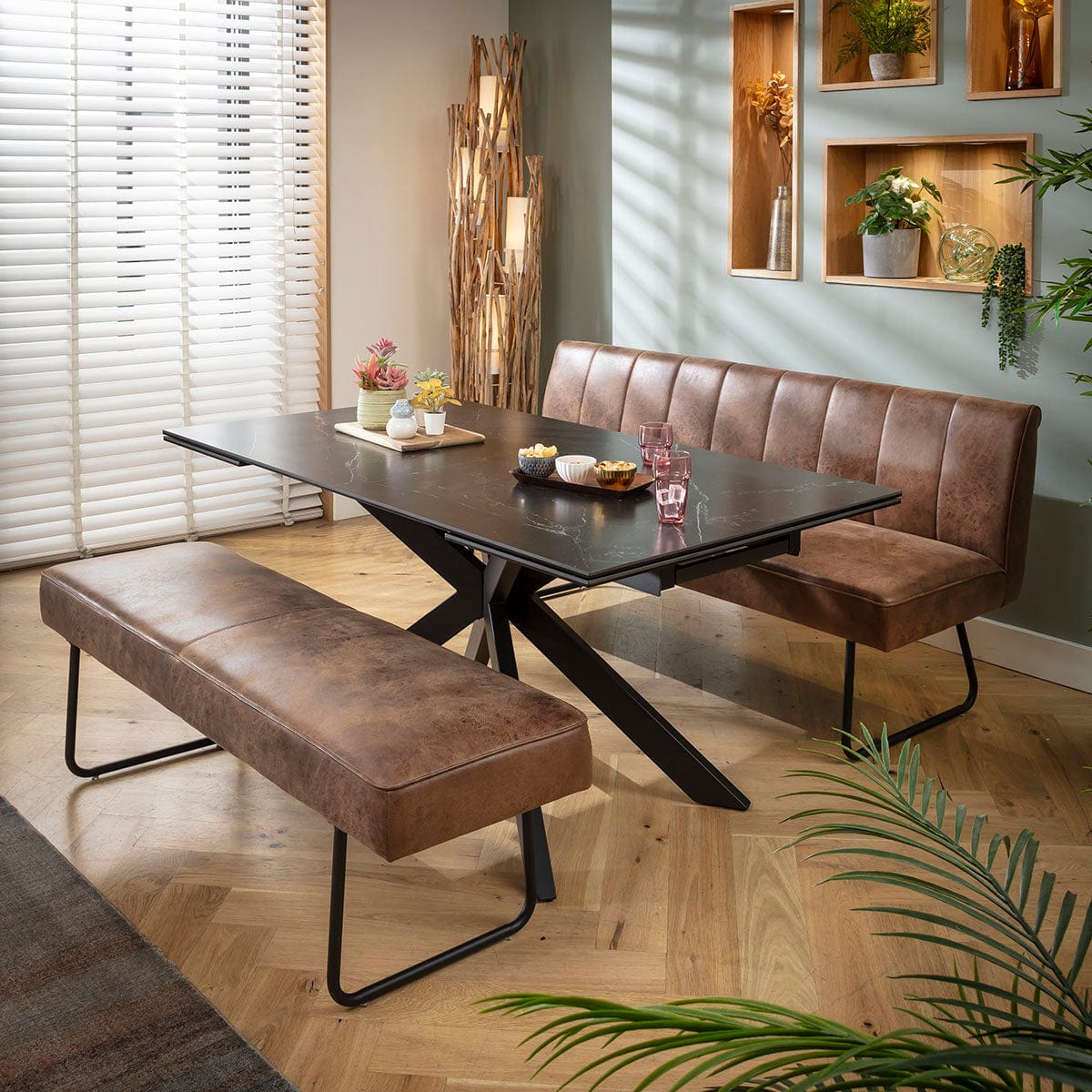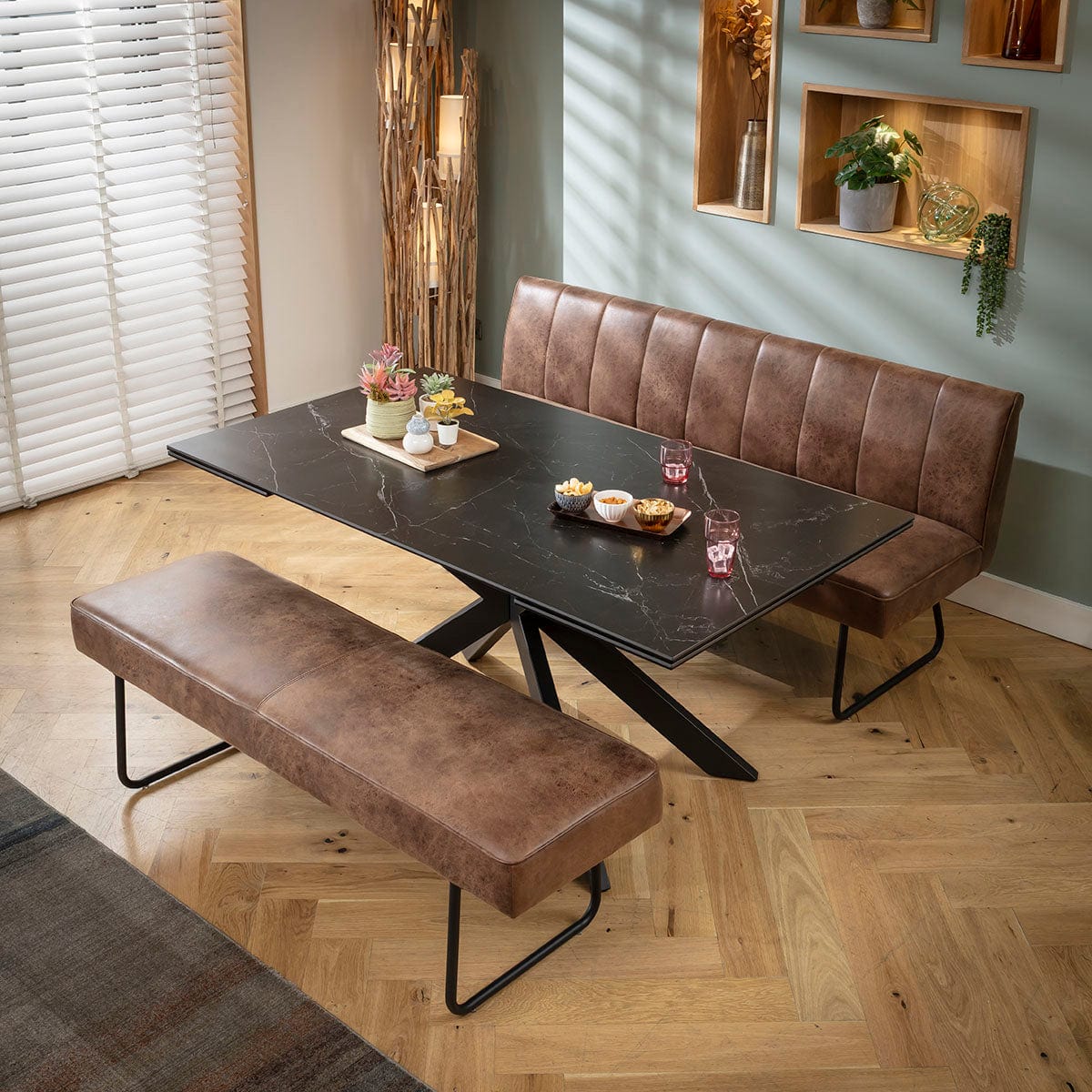 This 6 seater bench dining set includes our large designer ceramic marble extending dining table in black with no gap down the middle, with two dining benches - one backless and the other with a backrest in antique brown leather-look fabric. This modern dining set is crafted for practicality and comfort.