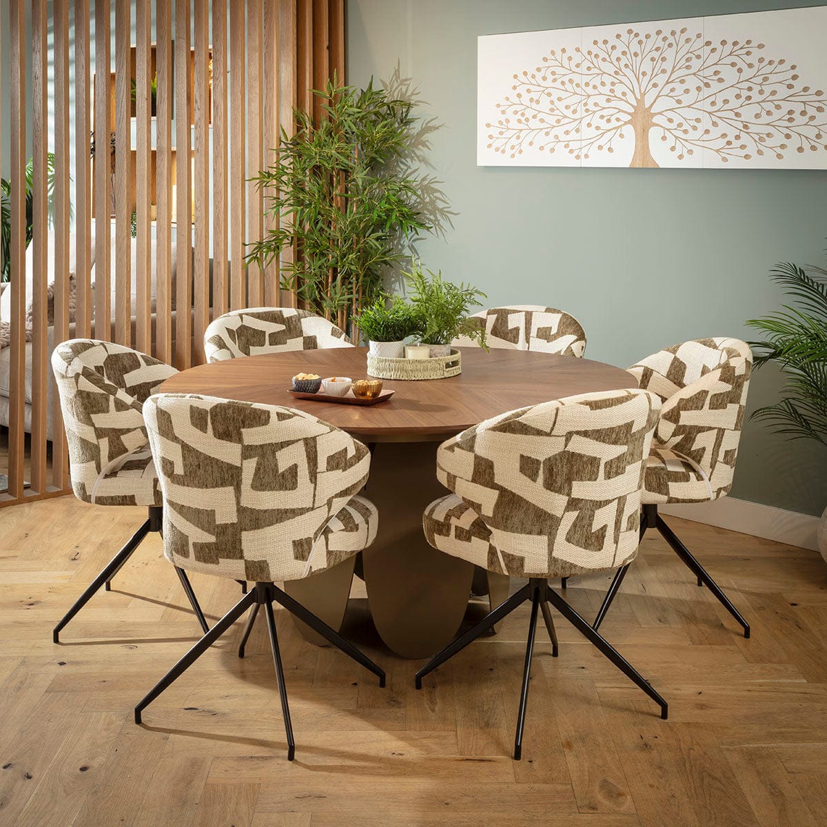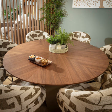 The Phoenix 6 seater dining table boasts a striking round top measuring 150cm x 150cm. The tabletop is crafted from walnut veneer, chosen for its rich depth and resilience. Its surface is tough and durable, ideal for daily use. A sculpted metal base with a powder-coated Champion Gold finish adds refinement and stability. Built from premium materials, this modern round dining table is made to last, supporting the demands of busy homes.