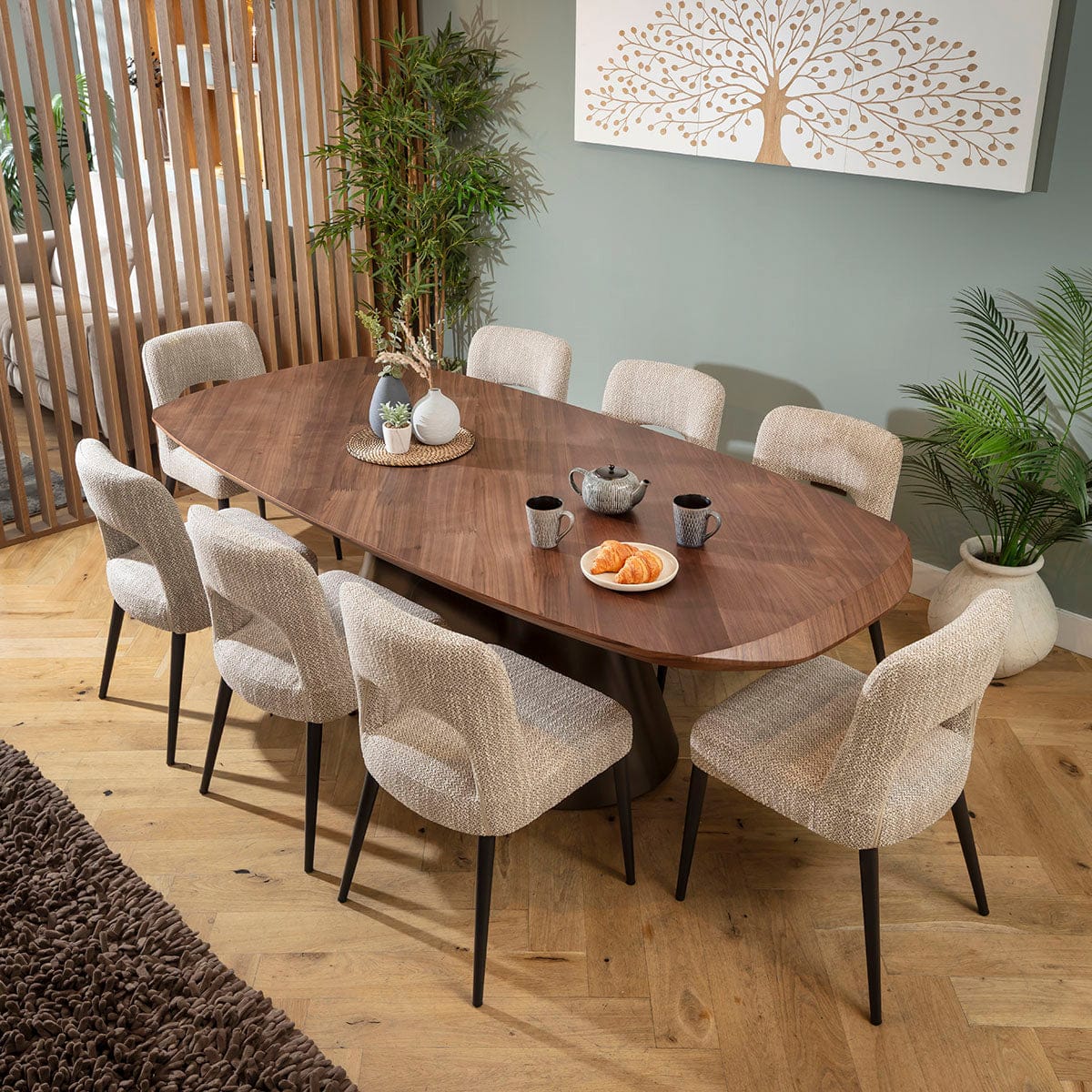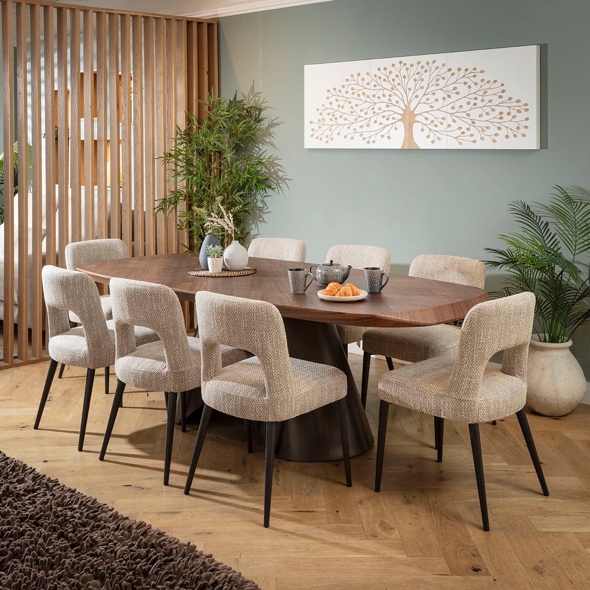 The Phoenix 8 seater dining table boasts a commanding presence, defined by its spacious 240cm x 110cm surface and inviting warm wooden top. Comfortably seating 8, the tabletop is made from durable walnut veneer that offers depth and natural variation. The metal base is finished in powder-coated copper for strength and visual impact. Built from premium materials that resist everyday wear, this table is designed to stay beautiful and reliable in even the busiest households.