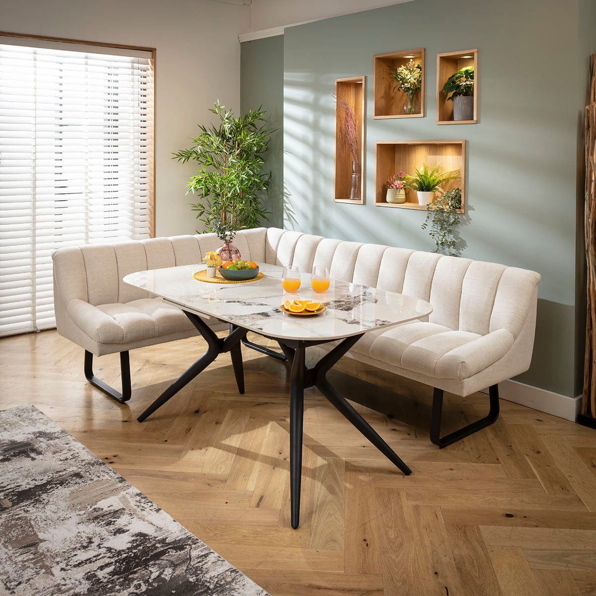 This 5 seater corner bench dining set includes our modern extending dining table, it has a luxury white gold ceramic marble top and metal legs, with the Harvey corner dining bench in a super soft stone fabric and black metal legs. This corner dining set is crafted for practicality and comfort.