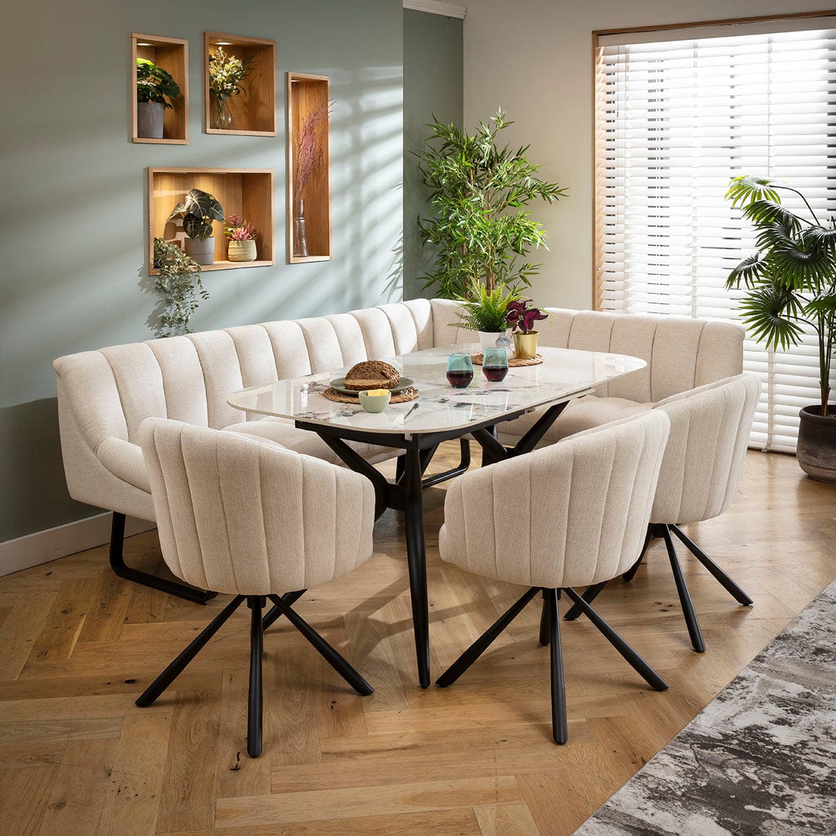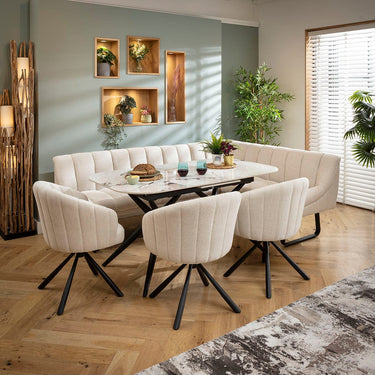 This 8 seater corner bench dining set includes our modern extending dining table, it has a luxury white gold ceramic marble top and metal legs, with a Harvey corner dining bench and 3 dining chairs in super-soft stone fabric. This corner dining set is crafted for practicality and comfort.