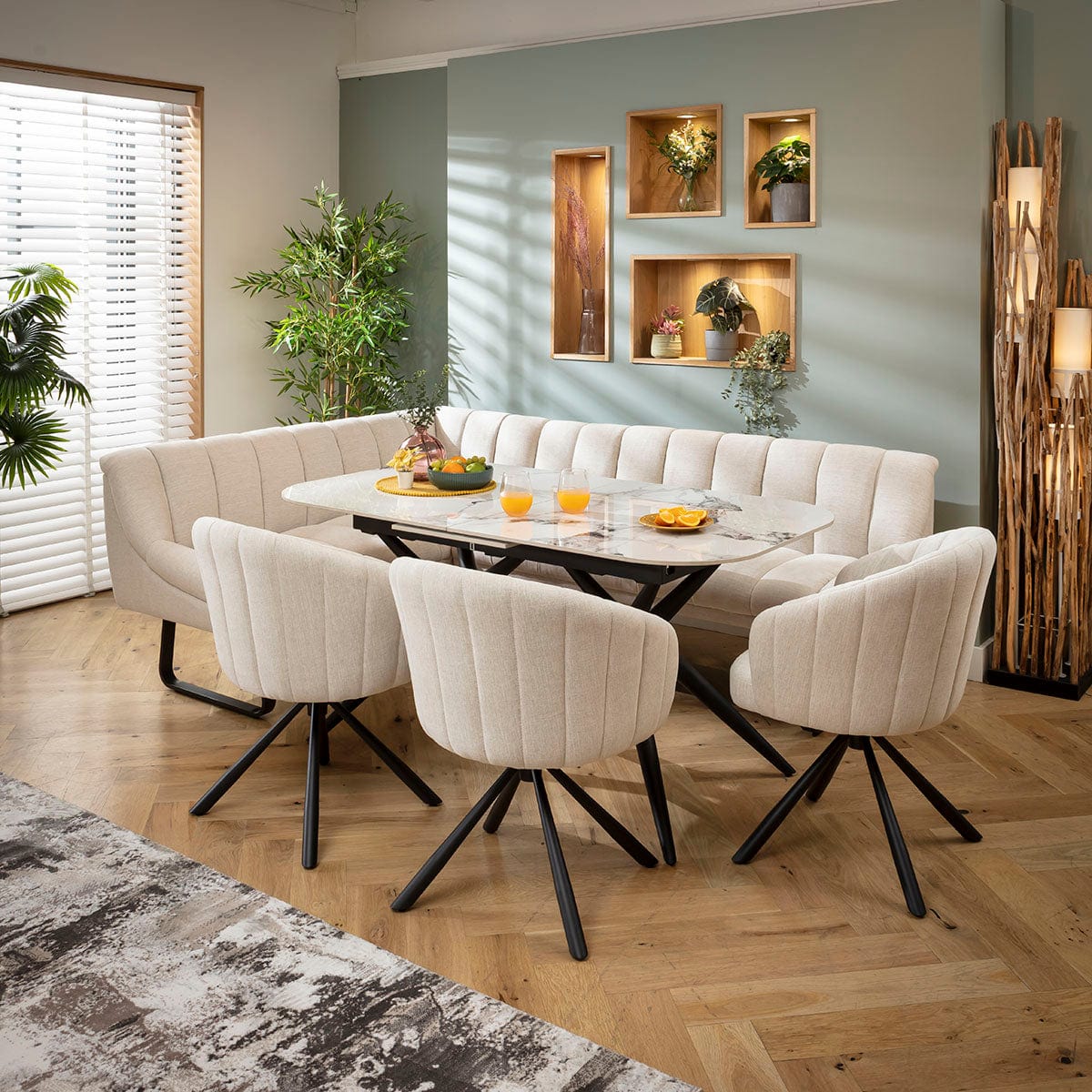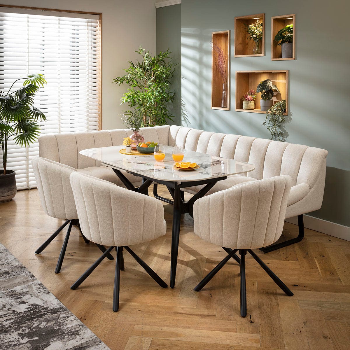 This 8 seater corner bench dining set includes our modern extending dining table, it has a luxury white gold ceramic marble top and metal legs, with a Harvey corner dining bench and 3 dining chairs in super-soft stone fabric. This corner dining set is crafted for practicality and comfort.